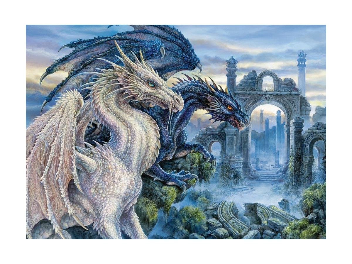 Această ilustrație digitală redă o scenă impresionantă cu doi dragoni majestuoși, poziționați unul lângă celălalt, supraveghind ruinele unei cetăți antice. Dragonul din stânga este alb, cu solzi strălucitori și ochi blânzi, în timp ce cel din dreapta este albastru și negru, cu ochi roșii pătrunzători, sugerând o posibilă rivalitate sau protecție mutuală. Ruinele, stilizate cu arce gotice și coloane distruse, adaugă o atmosferă mistică și veche scenei, unde natura pare să înceapă să înlocuiască structurile omenești. Cerul deasupra este învăluit în nori, cu nuanțe de albastru și gri, accentuând atmosfera enigmatică a întregii compoziții.