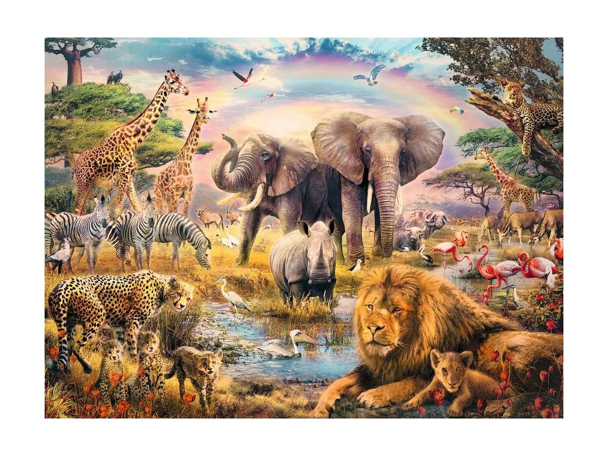 Ilustrația redă o scenă vibrantă din savană, plină de viață și culoare, unde diverse specii de animale sălbatice coexistă. În centrul compoziției, un elefant impunător, acompaniat de puii săi, se evidențiază printr-o prezență majestoasă, având în fundal un curcubeu ce împodobește cerul. Pe partea stângă, un leu, regele savanei, își odihnește privirea vigilentă asupra teritoriului său, în timp ce un pui de leu se joacă lângă el. Alte animale precum girafe, zebre și flamânzi adaugă dinamism scenei, fiecare specie fiind reprezentată în activități caracteristice. Apa limpede dintr-un mic lac adună mai multe specii, inclusiv hipopotami și păsări acvatice, completând astfel tabloul natural.