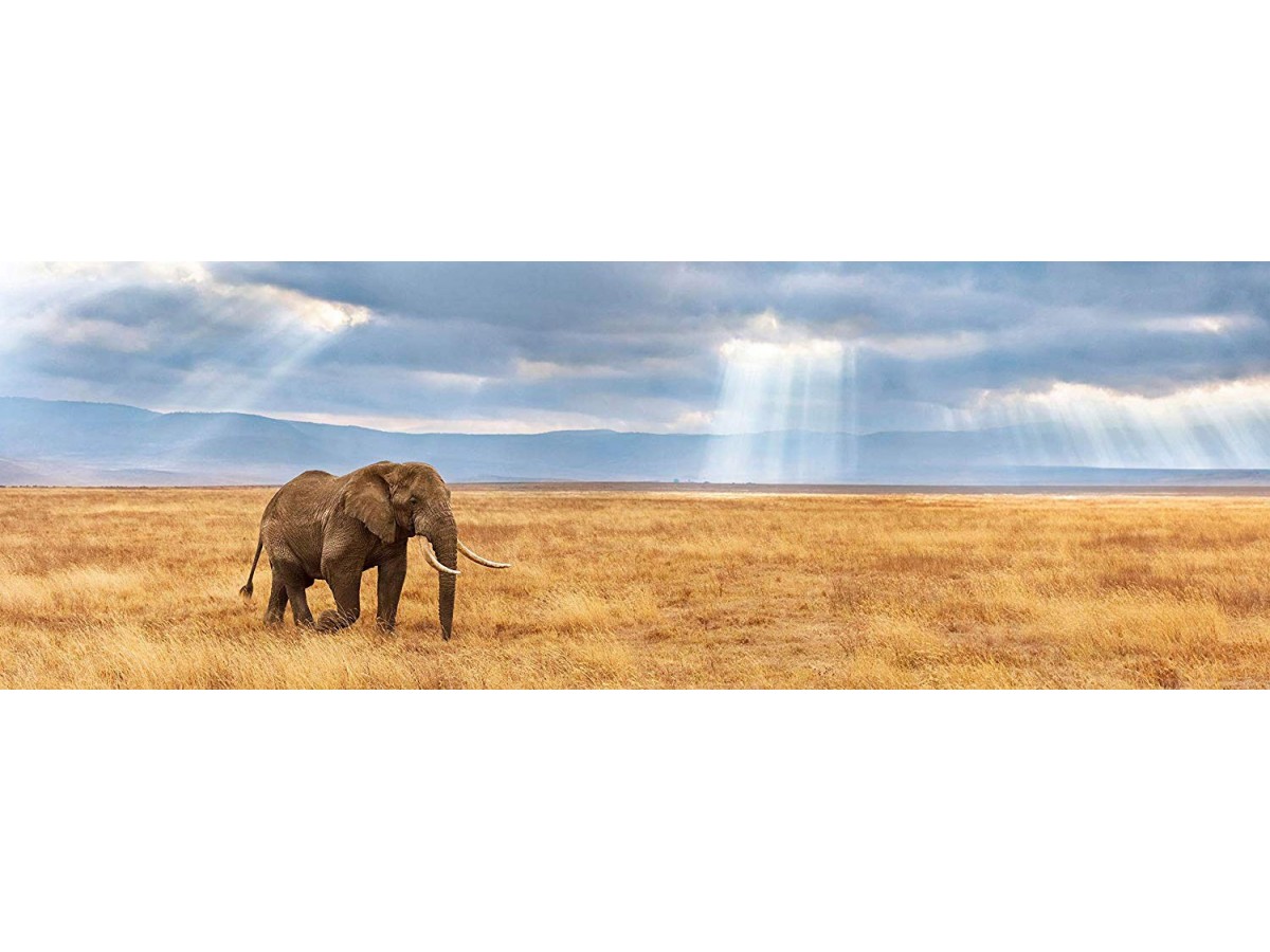 Imaginea reprezintă o scenă naturală captivantă, dominată de prezența unui elefant adult în centrul unui vast câmp arid, probabil situat într-o savană africană. Animalul impunător, cu pielea îngroșată și colți lungi, pășește singuratic sub un cer vălurit parțial de nori densi. Razele de lumină solară străbat norii, creând un efect dramatic și accentuând senzația de vastitate și izolare. Fundalul este accentuat de culorile neutre ale ierburilor uscate și ale cerului plumburiu, reușind să transmită o atmosferă de calm și de înstrăinare. Această fotografie panoramică surprinde esența vieții sălbatice în habitatul său natural, oferind o priveliște asupra vieții în savană, unde condiții meteorologice și geografice diverse coexistă.