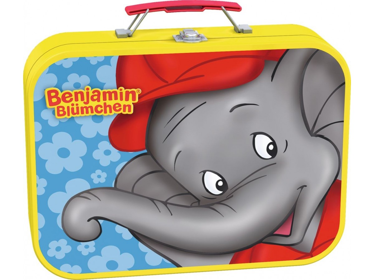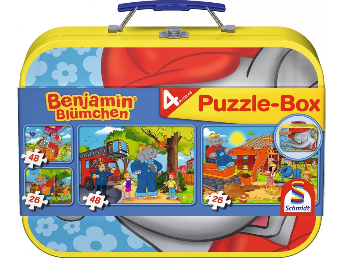 Imaginea puzzle-ului Schmidt - Benjamin, elefantul, cu 2x26 + 2x48 piese, surprinde o serie de scenete viu colorate ce ilustrează diverse activități urbane și rurale, având în centrul atenției un elefant antropomorfizat și alte personaje animale și umane. Prima scenetă redă elefantul și un grup de copii în fața unei fântâni, într-o zi senină de parc. A doua scenetă îl prezintă pe elefant alături de alte personaje la o stație de pompieri, explorând echipamentele și interacționând cu un pompier. Sceneta a treia ne arată același elefant într-un tren, călătorind printr-un peisaj rural, în timp ce ultima scenetă ilustrează elefantul în diverse situații la o fermă, interacționând cu animalele. Fiecare scenă este plină de culoare și dinamică, creând o atmosferă veselă și energică.