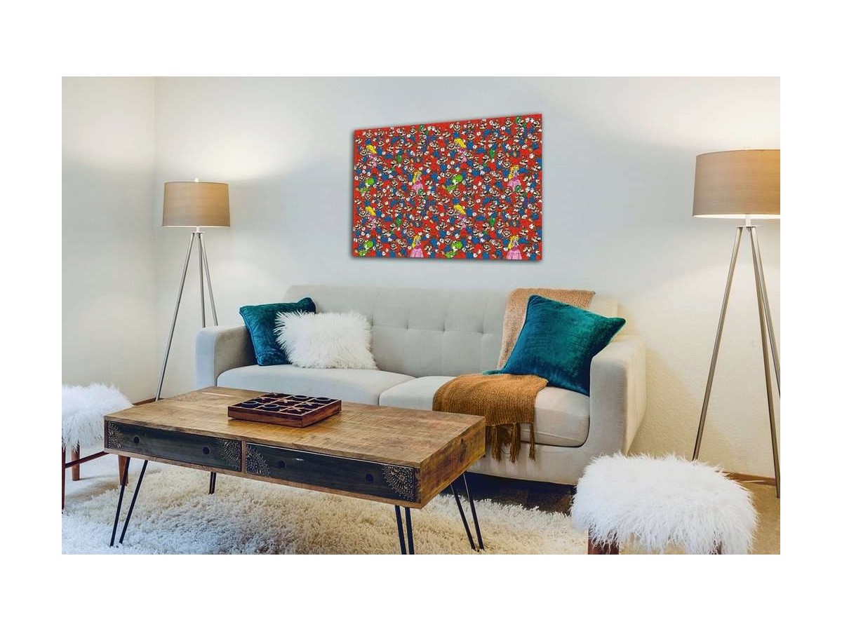 Această ilustrație digitală reprezintă o gamă largă de personaje din seria de jocuri video Super Mario, cunoscută de Nintendo. Scena este plină de culori vii, unde fiecare segment al imaginii surprinde diferite personaje iconice, cum ar fi Mario, Luigi, Princess Peach și Yoshi, desfășurându-se pe un fundal roșu intens cu detalii albastre și verzi. Aceasta oferă o perspectivă amuzantă și energică, plină de acțiune și interacțiuni caracteristice, unde personajele par că sar, zboară și se alergă unul după altul, creând o scenă vibrantă și dinamică, perfectă pentru fanii seriei.