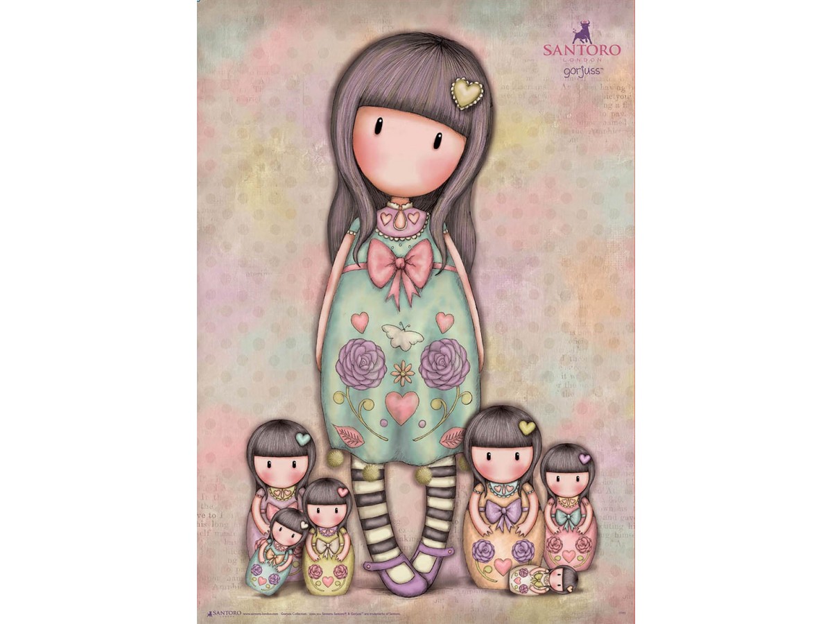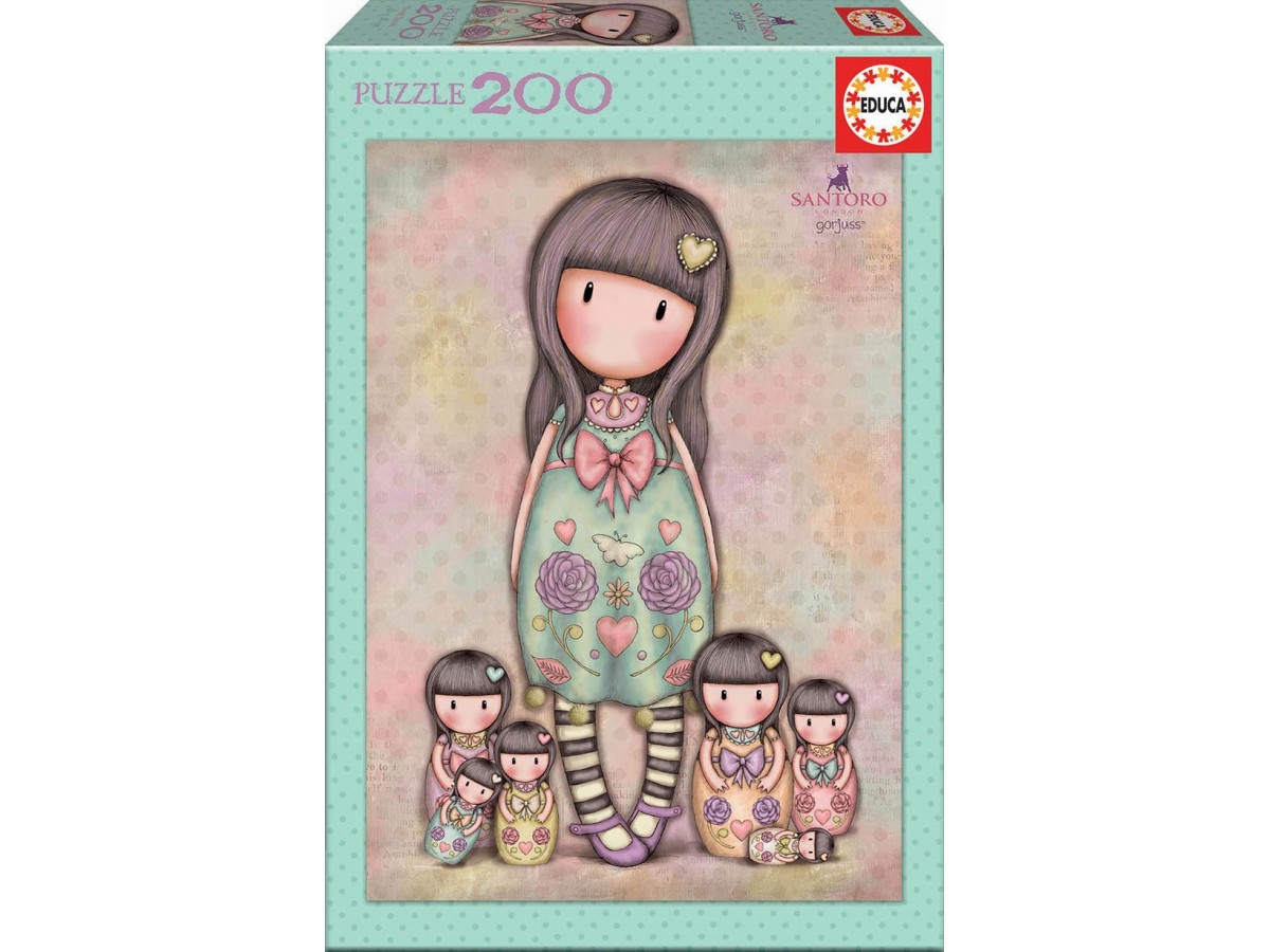 Ilustrația prezentată pe puzzle-ul Educa - Gorjuss - Seven Sisters, 200 piese (17192) este caracterizată prin stilul distinctiv al artistului Suzanne Woolcott, cunoscut pentru crearea seriei Gorjuss. Imaginea îlustrată arată cinci fetițe îmbrăcate în rochițe ornate cu diverse motive florale și modele inimă. Personajul principal, de dimensiuni mai mari, stă în centrul compoziției și este îmbrăcat într-o rochie verde deschis decorată cu flori și inimi, având părul lung și drept, cu o singură agrafă în formă de inimă. Celelalte patru fete, mai mici în dimensiune, stau aliniate în fața acesteia. Toate personajele au ochii închiși, ceea ce adaugă un aer de mister și calm compoziției. Fundalul este texturat, cu tonuri pastelate de roz, verde și bej, conferind o notă caldă și primitoare.