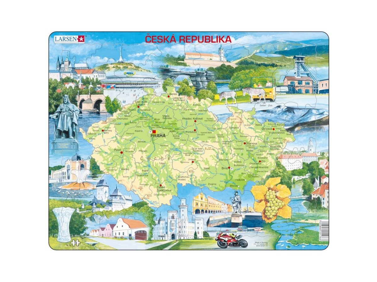 Imaginea puzzle-ului Larsen - Physical Map of Czech Republic, 78 piese (48628) prezintă o hartă fizică detaliată a Republicii Cehe, ilustrată cu diverse peisaje și clădiri caracteristice acestei țări. Centrul imaginii este ocupat de harta națională colorată în nuanțe de verde, delimitând cu atenție fiecare regiune. Marginile sunt decorate cu scene din locații renumite cum ar fi castelul Praga, orașul medieval Český Krumlov, un viaduct și peisaje rurale, toate ilustrate într-un stil plin de detalii ce evidențiază farmecul arhitectural și natural al țării.