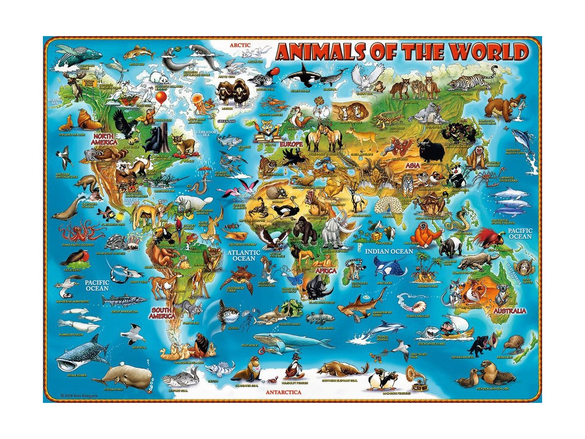 Ilustrația puzzle-ului Ravensburger - Animals around the World, 300 piese XXL (13257) prezintă o hartă colorată a lumii, plină de reprezentări stilizate ale diferitelor specii de animale specifice fiecărui continent și ocean. De la ursul polar și renii din Arctica, la pinguinii și focii din Antarctica, fiecare continent este populat de animale caracteristice, precum elefanți, tigri și jaguari. Oceanele sunt populate cu diverse specii marine, de la rechini la delfini, fiecare grup de animale fiind înconjurat de apele albastre specifice regiunilor lor.