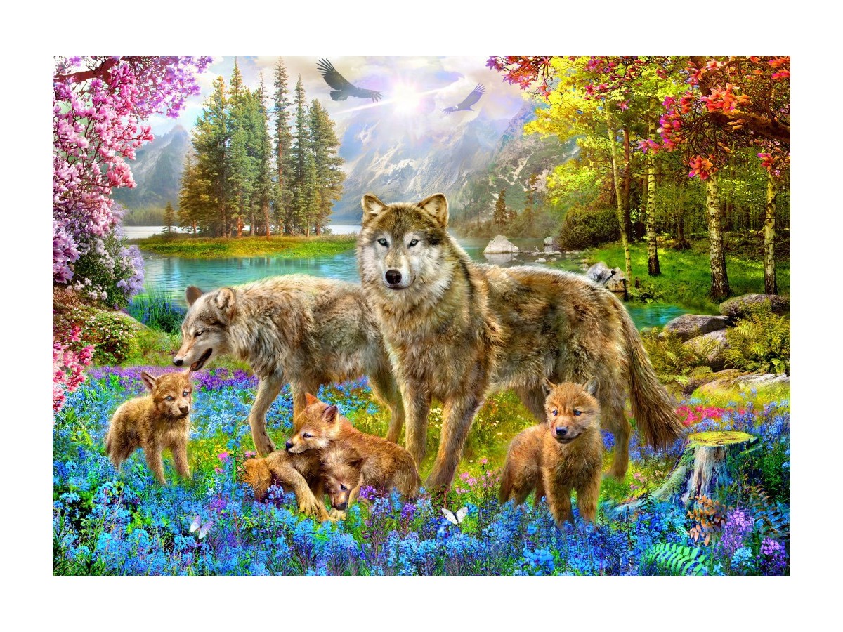 Imaginea ilustrează o familie de lupi într-un peisaj vibrant și colorat de primăvară. În centru, un lup adult stă drept, privind direct spre privitor, înconjurat de patru pui de lupi. Doi dintre pui sunt în față, jucându-se, în timp ce ceilalți doi sunt mai aproape de adult, unul dintre ei fiind mângâiat de lupul mare cu botul. Fondul este un amalgam de culori vii, predominând albastrul și verdele, reprezentând un lac și o pădure. Peisajul include de asemenea copaci în floare și diverse flori sălbatice. Munții înalți și un cer albastru cu nori puțini și dispersați se pot vedea în depărtare.
