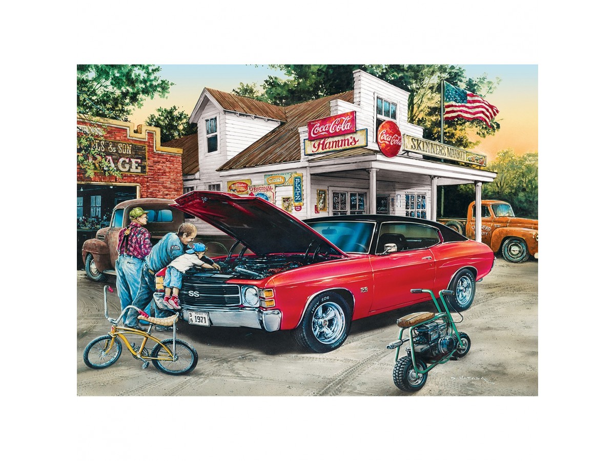 Imaginea ilustrează o scenă vibrantă într-un orășel american tipic anilor '60-'70. În centrul compoziției este un automobil sport roșu, un Chevrolet SS, cu capota ridicată, în jurul căruia se adună patru persoane, aparent interesate de mecanica acestuia. În spatele scenei principale, peisajul urban este marcat de clădiri retro, printre care un garaj vechi și o reclamă Coca-Cola pe un perete lateral. Drapelul Statelor Unite fluturând și indicatoarele vechi de stradă completează atmosfera nostalgică. Cerul este limpede, cu nuanțe calde de amurg, conferind întregului tablou o notă de serenitate și clasic american.