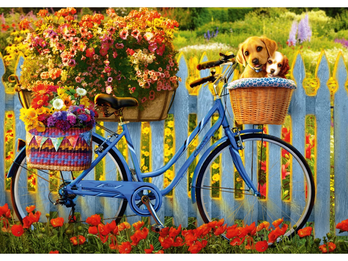 Imaginea prezentată în puzzle-ul Schmidt - Sunday Outing With Good Friends, 500 piese (58957) redă o scenă idilică în aer liber. O bicicletă albastră este parcată lângă un gard vopsit în alb, cu un coș mare de flori viu colorate în partea din față a bicicletei. Două câini adorabili, unul maro și unul alb cu pete negre, sunt așezați într-un coș mai mic atașat de ghidonul bicicletei, privind înspre privitor. Scena este completată de un fundal plin de flori de diferite culori și tipuri, un gard viu și un teren cu iarbă bine întreținută se observă în spate.