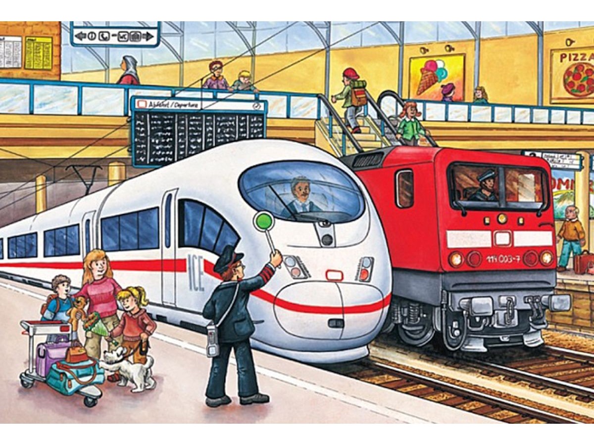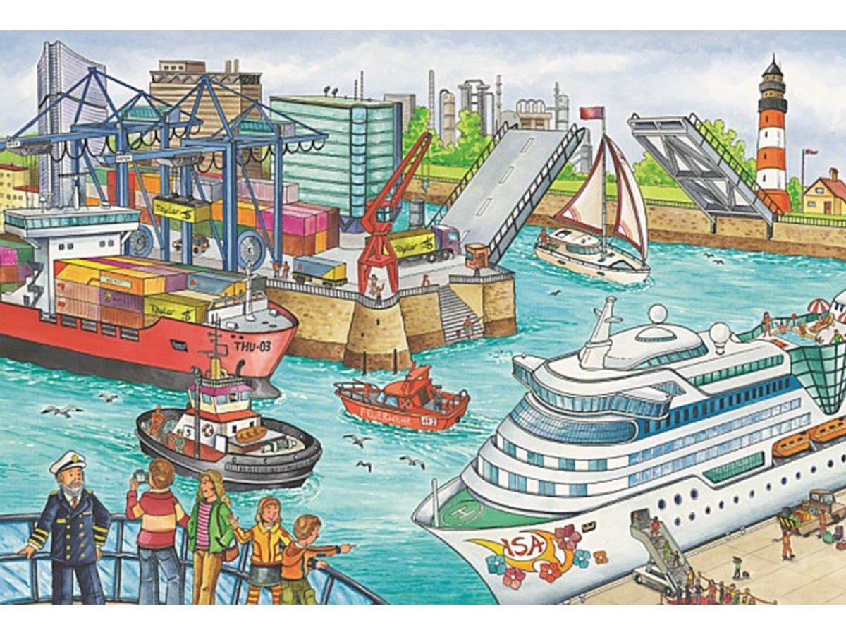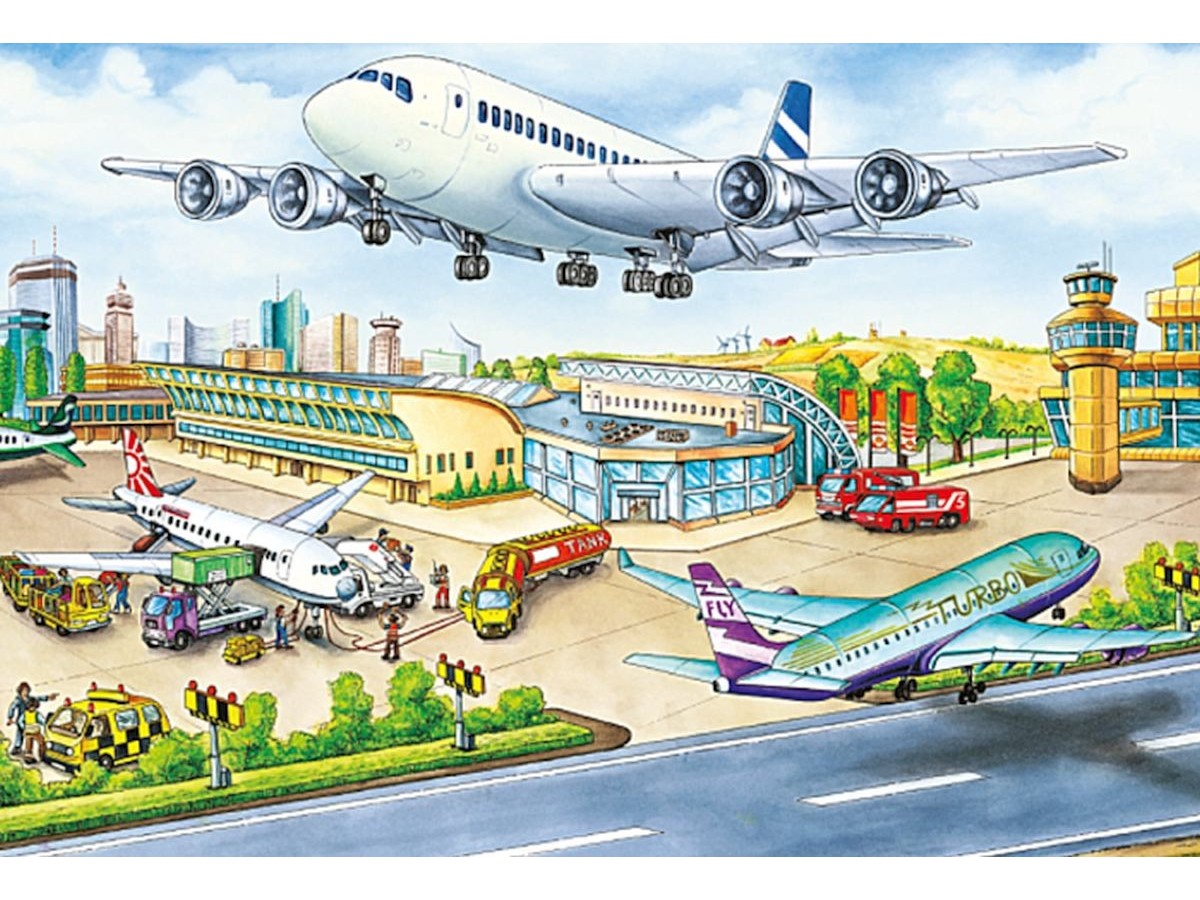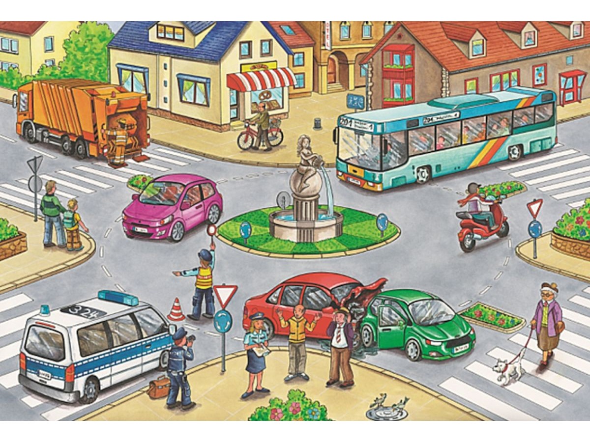 Ilustrația puzzle-ului Schmidt - Vehicles surprinde o scenă urbană animată, caracterizată prin prezența mai multor vehicule și personaje în diverse activități cotidiene. Observăm în centru un rond cu o statuie, înconjurat de mașini colorate și un autobuz verde care parcurge un traseu indicat. Străzile sunt bine delimitate de marcaje rutiere, iar trotuarele sunt animate de pietoni. Un bărbat cu o servietă și o femeie care împinge un cărucior contribuie la vitalitatea scenei. De asemenea, pe partea stângă, un camion portocaliu se pregătește de plecare, întregind tabloul urban.