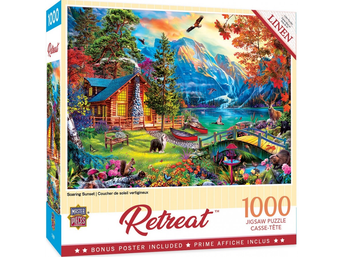 Imaginea puzzle-ului Soaring Sunset de la brandul Master Pieces prezintă un peisaj pitoresc ce pare a fi o pictură cu accente realiste, combinând elemente naturale cu detalii arhitecturale rustice. În centrul compoziției se află o cabană de lemn, amplasată într-un decor sălbatic plin de verdeață. În jurul cabanei se zăresc mai multe animale sălbatice, inclusiv ursi, cerbi și racooni, ceea ce adaugă un sentiment de viață și dinamism scenei. Lacul calm din fundal reflectă muntele îndepărtat, iar cerul este pictat în culori vibrante de apus. Pe cer, un vultur zboară, accentuând înălțimea și vastitatea peisajului.