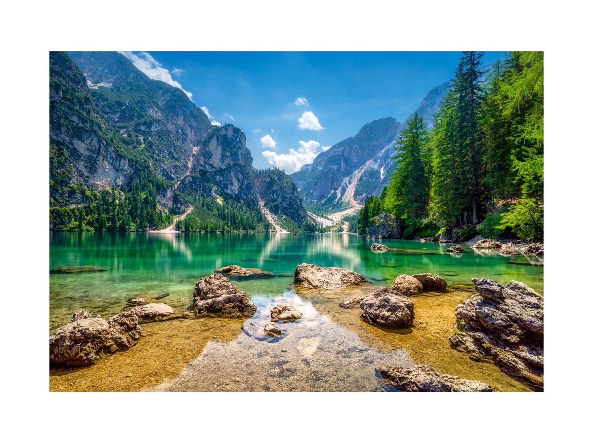 Imaginea acestui puzzle Castorland - Heaven's Lake, cu 1000 de piese, surprinde frumusețea naturală a unui peisaj montan panoramic. Lacul cristalin, înconjurat de stânci și munți înalți, reflectă cerul senin și vârfurile împădurate din jur. Cu apele sale verzi-turcoaz, lacul adaugă un farmec aparte întregii compoziții, iar munții acoperiți de zăpadă și vegetație completează tabloul cu o notă de măreție.