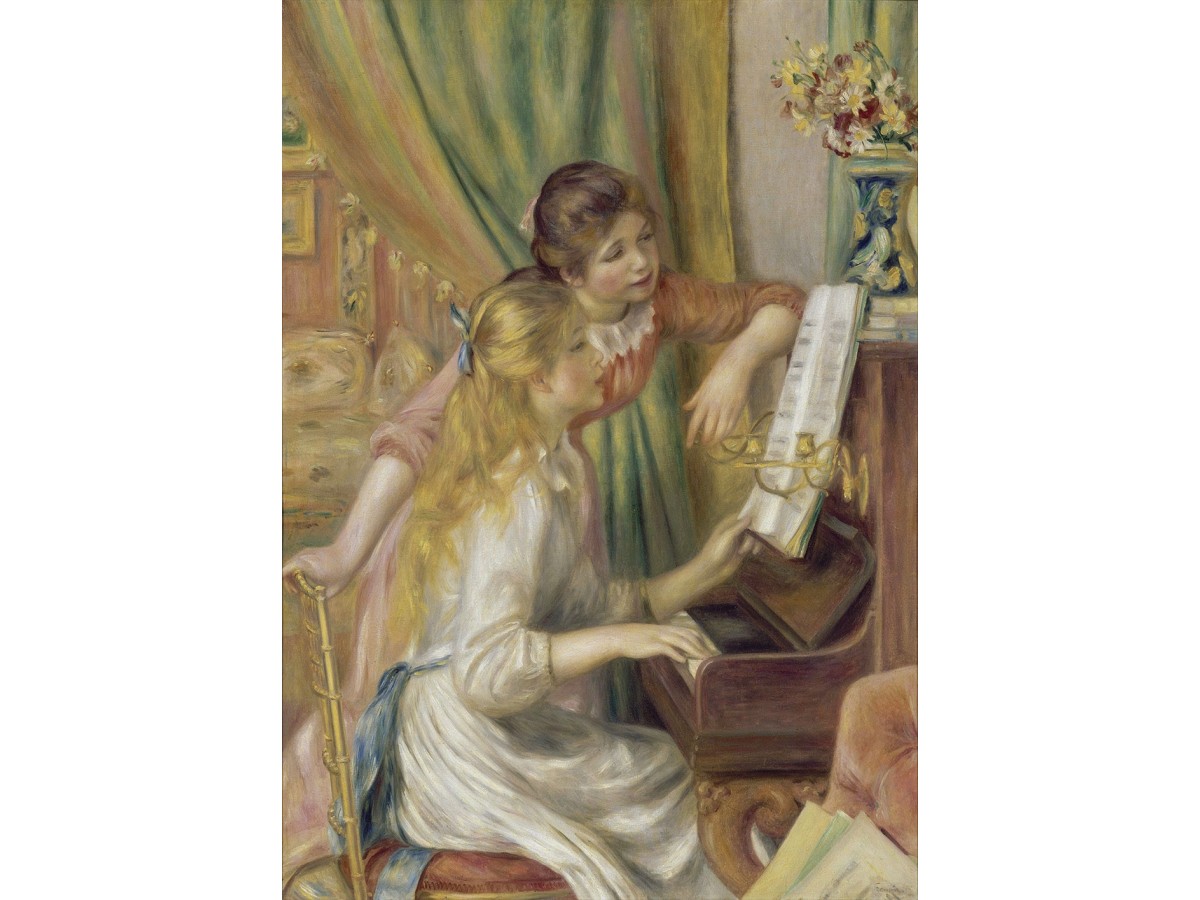 Această pictură intitulată 'Young Girls at the Piano' este o operă creată de Auguste Renoir în anul 1892. Imaginea redă două tinere îmbrăcate în ţinute elegante de secol 19, una dintre ele stă la pian şi cealaltă stă în picioare lângă ea, indicând probabil o partitură muzicală. Pianul este amplasat într-o încăpere luminată, decorată cu draperii şi un covor bogat în culori, iar pe fundal se observă un vas cu flori viu colorate. Stilul artistic al lucrării este impresionist, caracterizat prin pături de pensulă vizibile şi o focalizare pe efectele de lumină şi culoare.