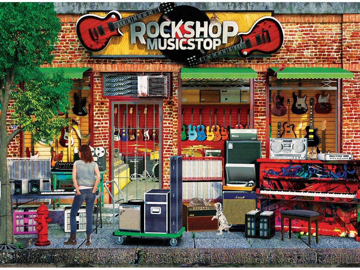 Ilustrația digitală a puzzle-ului Paul Normand: Rock Shop de la Eurographics prezintă un magazin de muzică cu o fațadă din cărămidă, plin de ferestre vitrate ce dezvăluie diverse instrumente muzicale. În fața magazinului se află accesorii muzicale, inclusiv o chitară electrică în formă de aripă, amplificatoare și o vitrină cu discuri colorate. O femeie trage un cărucior cu echipament muzical, iar în preajmă se află un câine mic, alb-negru, legat de un hidrant roșu, completând atmosfera urbană.