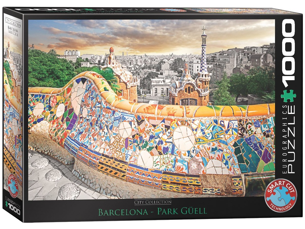 Imaginea puzzle-ului Eurographics - Barcelona, 1000 piese (6000-0768) surprinde una dintre cele mai emblematice și colorate zone din Parcul Güell din Barcelona, opera arhitecturală a lui Antoni Gaudí. În prim-plan, se poate vedea bancul unduit, acoperit cu bucăți de ceramică mozaicate, reflectând o paletă largă de culori vibrante. Această ilustrație capturează esența stilului modernist al lui Gaudí, fiind un amestec distinctiv de forme organice și texturi expresive. În fundal, se disting siluetele caracteristice ale orașului Barcelona, inclusiv turlele și acoperișurile zvelte ale unor clădiri. Culoarea cerului este un albastru clar, contribuind la o atmosferă luminată și aerisită, specifică zilelor însorite. Elementele de arhitectură și mozaicurile complexe sunt puncte focale ale acestei reprezentări vizuale, evocând un sentiment de admirație pentru creativitatea și inovația lui Gaudí.