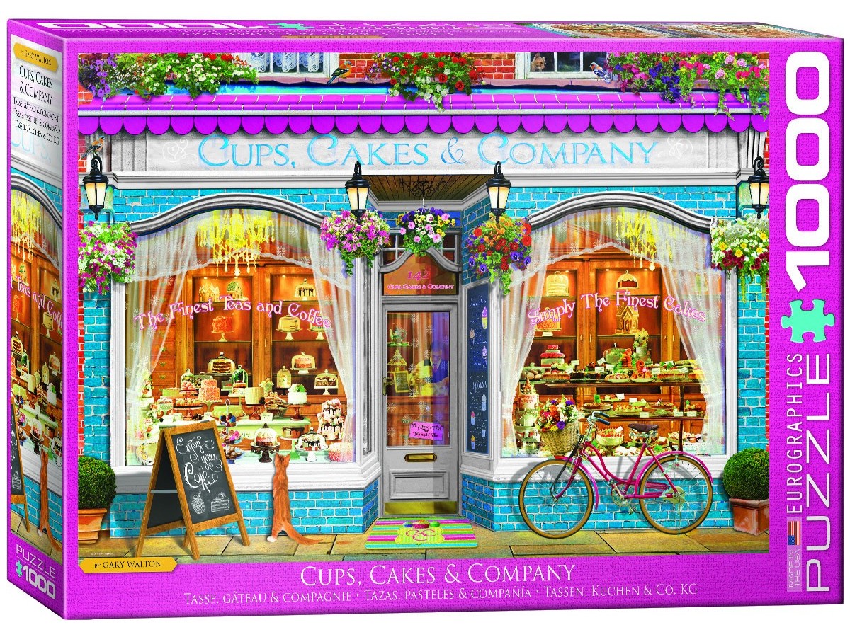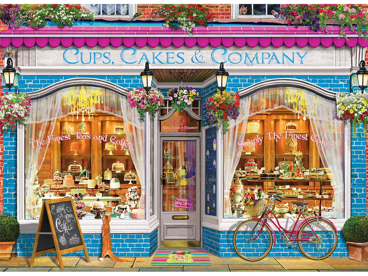 Acest puzzle Eurographics cu 1000 de piese surprinde o imagine detaliată a unei cofetării numită 'Cups, Cakes & Company'. Vitraliul colorat al magazinului este decorat cu flori roz și mov, adăugând un farmec vibrant întregii scene. Vitrina expune cu grijă o varietate de prăjituri și torturi, iluminate cald pentru a crea o atmosferă primitoare. În fața cofetăriei se află o bicicletă roz, parcată lângă un mic trotuar pavat, iar pe peretele lateral al clădirii se află un tablou negru cu inscripția 'The finest teas and coffees'.