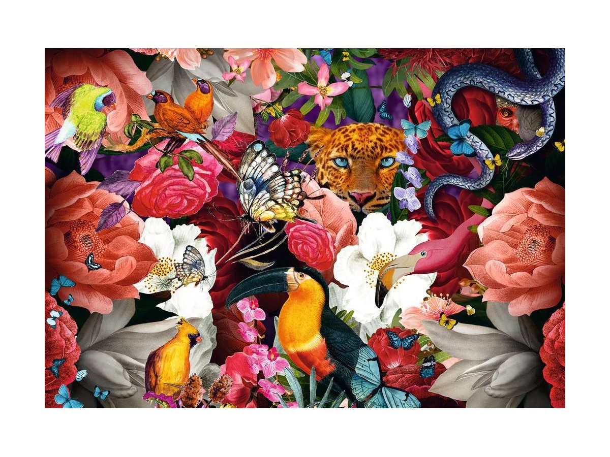 Imaginea ilustrează o compoziție vibrantă și colorată, plină de varietatea faunei și florei tropicale. În centrul ilustrației, un jaguar cu privire pătrunzătoare se remarcă printre petalele viu colorate ale florilor de diverse specii, de la trandafiri la hibisci. Înconjurat de fluturi colorați și păsări exotice precum papagali și colibri, jaguarul pare să fie atent la mișcările din jurul său. Spre marginea imaginii, un șarpe se încolăcește subtil, adăugând o notă de mister și pericol scenei. Această ilustrație digitală captează esența unei jungle dense, plină de viață și de culori strălucitoare, creând un peisaj captivant pentru privitor.