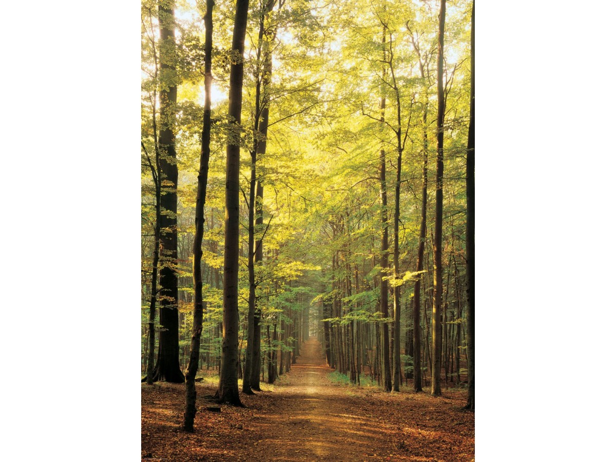 Fotografia surprinde un drum forestier ce se întinde printr-o pădure densă, cu copaci înalți și drepti, la apus sau răsărit de soare. Lumina blândă a soarelui pătrunde printre frunzele dese, creând jocuri de lumină și umbră pe poteca acoperită de frunze și pământ. Frunzișul verde predominant sugerează un peisaj de început de toamnă, iar privitorul pare că pătrunde vizual în profunzimea pădurii, ghidat de perspectiva liniei drepte a drumului.