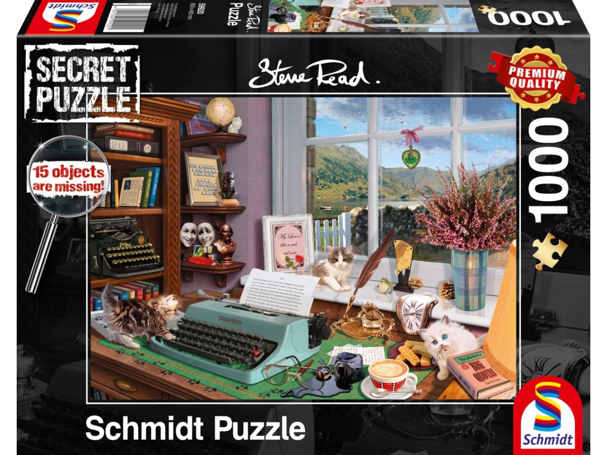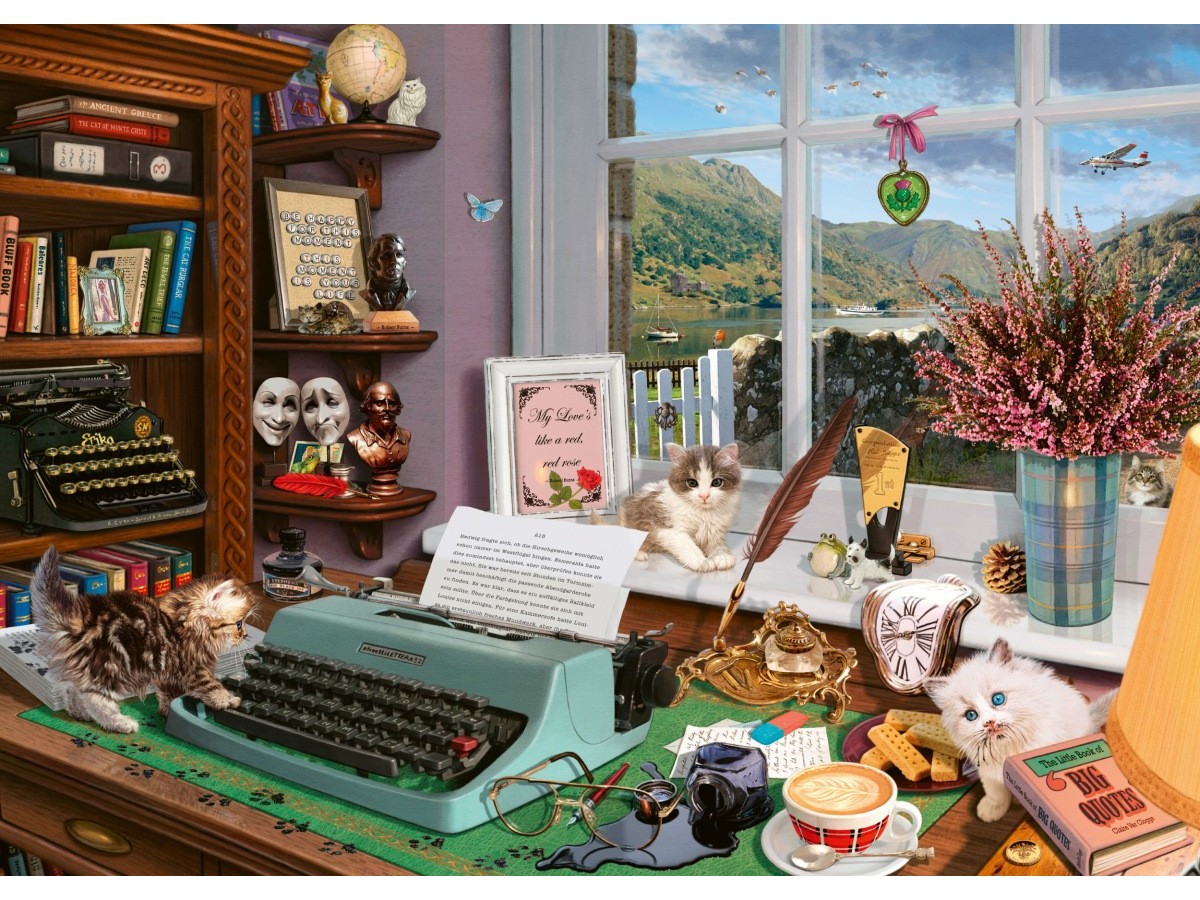 Imaginea puzzle-ului At The Writing Table prezintă o scenă detaliată în interiorul unei camere, organizată cu Număroase obiecte decorative și de uz personal. Pe un birou din lemn se află o mașină de scris vintage, între un ceainic, o ceașcă de ceai și diverse foi de hârtie. Biroul este flancat de un dulap plin cu cărți, suveniruri, o ramă cu fotografia unei familii și un glob pământesc. Pe fereastră, care deschide priveliștea către un peisaj montan idilic, sunt așezate mai multe figurine și o plantă. Atmosfera este plină de viață, înviorată de prezența a două pisici care se joacă printre obiectele de pe birou.