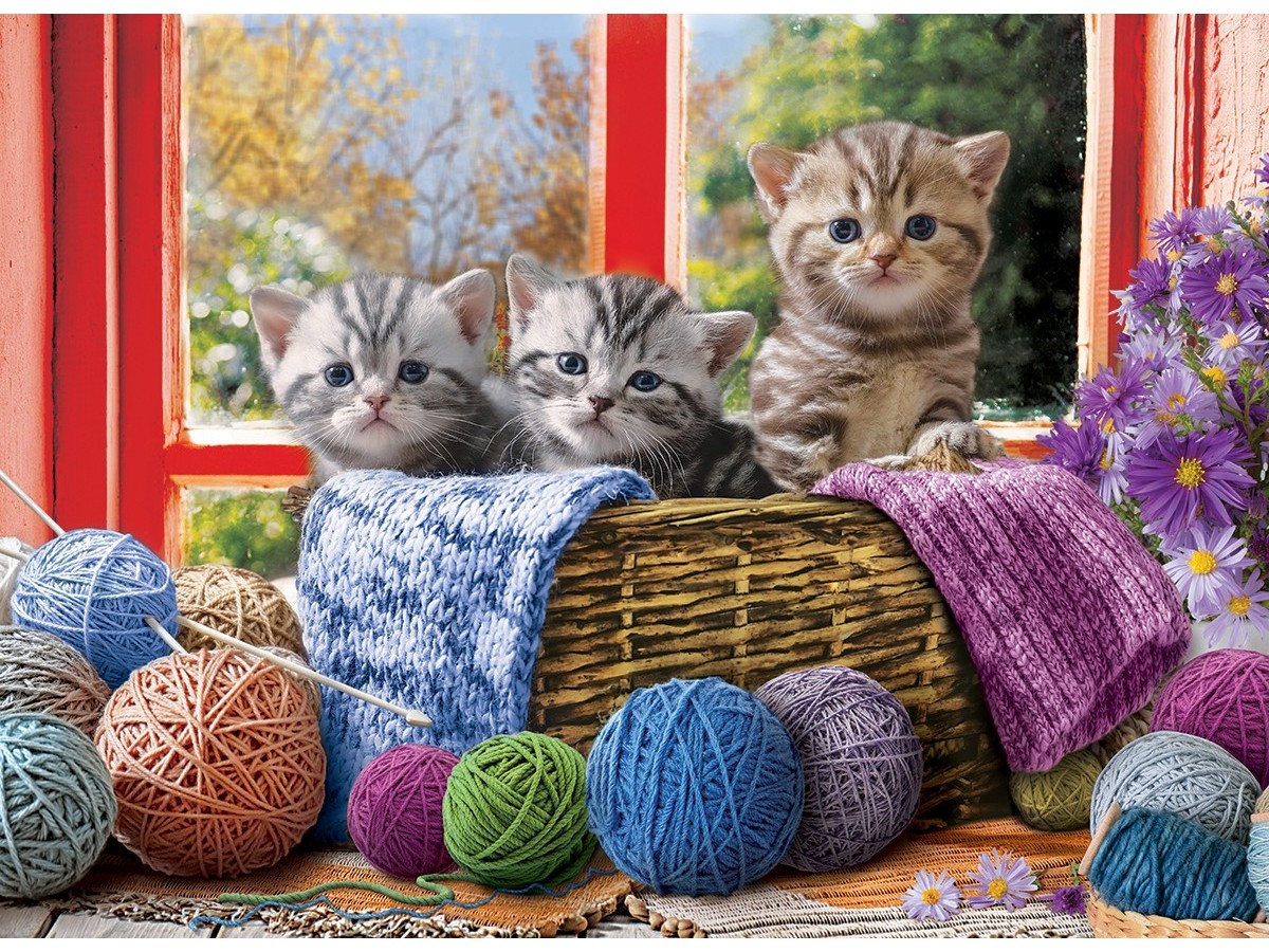 Această ilustrație digitală redă un grup fermecător de trei pui de pisică așezați lângă un coș de răchită și mai multe ghemotoace de lână colorate. Puii de pisică, doi cu dungi cenușii și unul maro, privesc cu curiozitate spre privitor, oferind o scenă plină de drăgălășenie și culoare. Coșul de răchită, așezat pe pervazul unei ferestre, este acoperit cu o pătură tricotată într-o nuanță de violet, creând un contrast plăcut cu ghemotoacele de lână într-o varietate de culori vii cum ar fi albastru, verde, roșu și galben. În fundal se zărește o scenă exterioară, unde vegetația bogată și lumina caldă a soarelui completează idilic acest tablou.