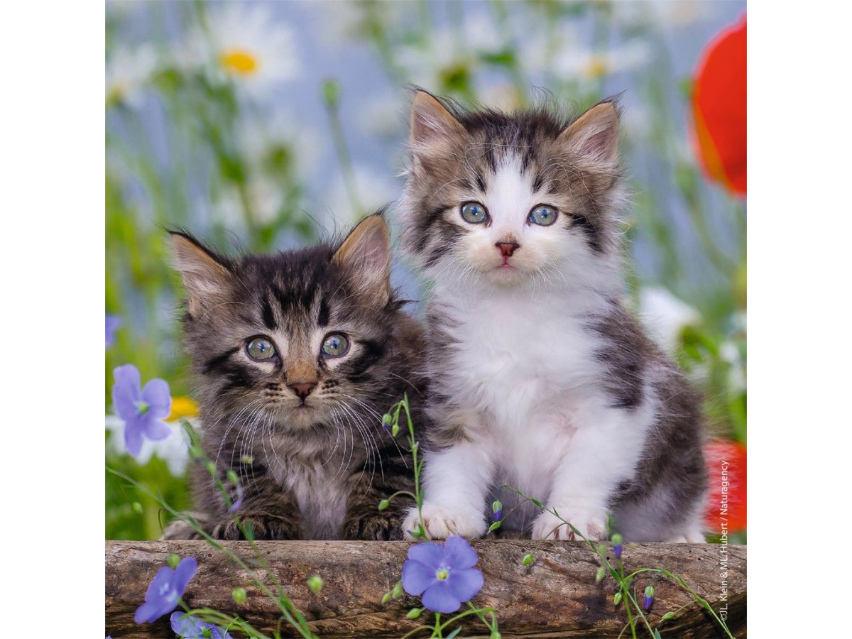 Imaginea reprezintă doi pui de pisică așezați într-un coș din lemn, cu ochi mari și curioși, privind direct spre privitor. Părul lor moale și strălucitor, cu modele simetrice predominant gri și alb, este detaliat și bine definit, sugerând că este vorba despre o fotografie colorată. Coșul este plasat pe iarbă verde, cu flori colorate în fundal, creând o atmosferă plăcută și primăvăratică.