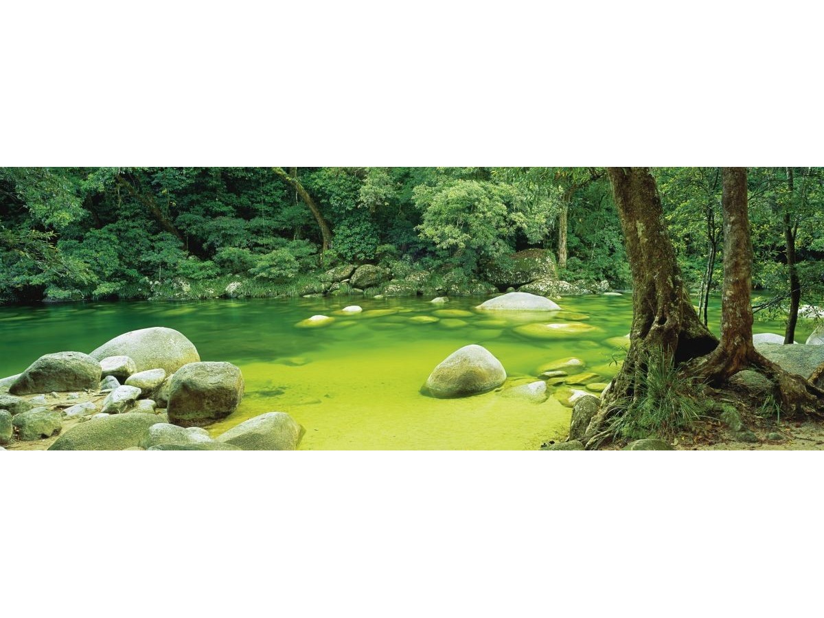 Imaginea acestui puzzle panoramic Schmidt - Mossman Gorge, Queensland, Australia, cu 1000 de piese (59286) surprinde o scenă pitorească din Mossman Gorge, Queensland, Australia. Vedem un râu liniștit înconjurat de pădure densă tropicală. Apa este clară și calmă, reflectând culorile vibrante ale vegetației. Pe malurile râului sunt împrăștiate pietre rotunjite de diferite dimensiuni, ce par să definească cursul apei. În prim-plan, o parte dintr-un copac cu rădăcini groase și trunchi inclinat adaugă un element de robustețe și vechime scenei.