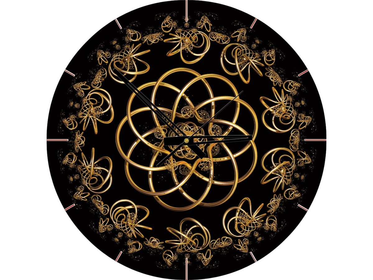 Imaginea reprezintă un ceas stilizat cu un design complex pe un fond negru. În centrul ceasului se găsesc mai multe cercuri suprapuse în tonuri de auriu, creând o impresie de mișcare și interconectare. Arazatoarele ceasului sunt, de asemenea, auriu și sunt proiectate într-un stil simplist, modern. În jurul designului central sunt dispersate diverse elemente decorative, cum ar fi fluturi și linii artistice, toate în nuanțe de aur pe fond negru, contribuind la un contrast vizual puternic. Această imagine este o ilustrație digitală, care folosește culori și forme pentru a crea un efect vizual de adâncime și complexitate.