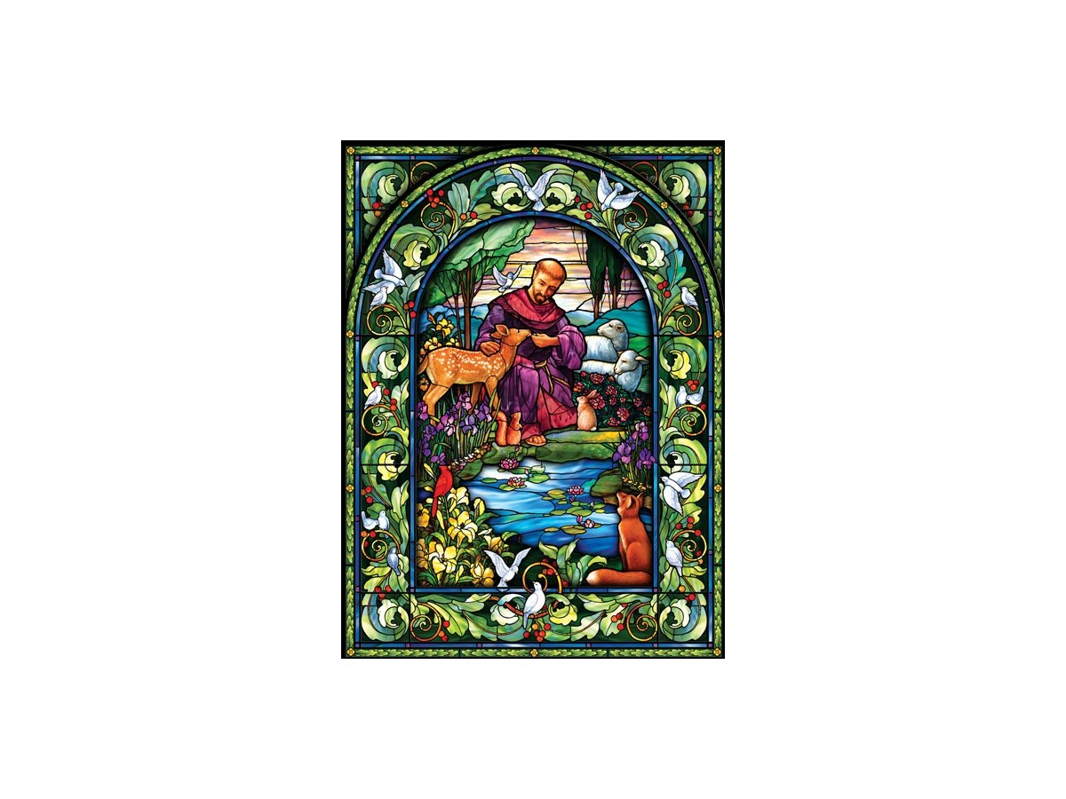 Imaginea reprezintă o pictură ce ilustrează o scenă religioasă, posibil inspirată de viața Sfântului Francisc de Assisi, cunoscut pentru dragostea sa față de creaturile lui Dumnezeu. Scena este plină de culoare, cu Sfântul Francisc în centru, îmbrăcat în robe monahale, hrănind un porumbel și alături de alte animale ca un cerb și un iepure. El este plasat într-un decor natural luxuriant, cu o multitudine de plante și flori, iar fundalul este un lac mic. Stilul artistic pare a fi vitraliu, datorită liniilor negre groase care delimitau vibrantul colorit al scenei.