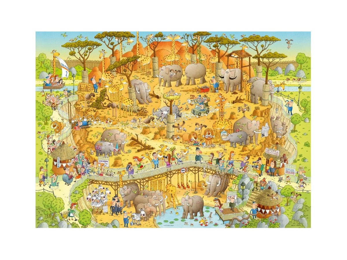 Această ilustrație vibrantă, creată de artistul Marino Degano, redă un habitat african plin de viață și culoare. Imaginea prezintă o varietate mare de animale sălbatice în activități umoristice și situații neașteptate: elefanți imenși stau la coadă la un fast-food, girafele participă la un spectacol de teatru, iar hipopotamii se bucură de o baie răcoroasă. O serie de poduri suspendate leagă diferite secțiuni ale acestui habitat, permitând observatorilor să se deplaseze printre diversele scene pline de umor și creativitate. O caracteristică distinctă este stilul caricatural și plin de detalii, elemente care adaugă dinamism și profunzime compoziției.