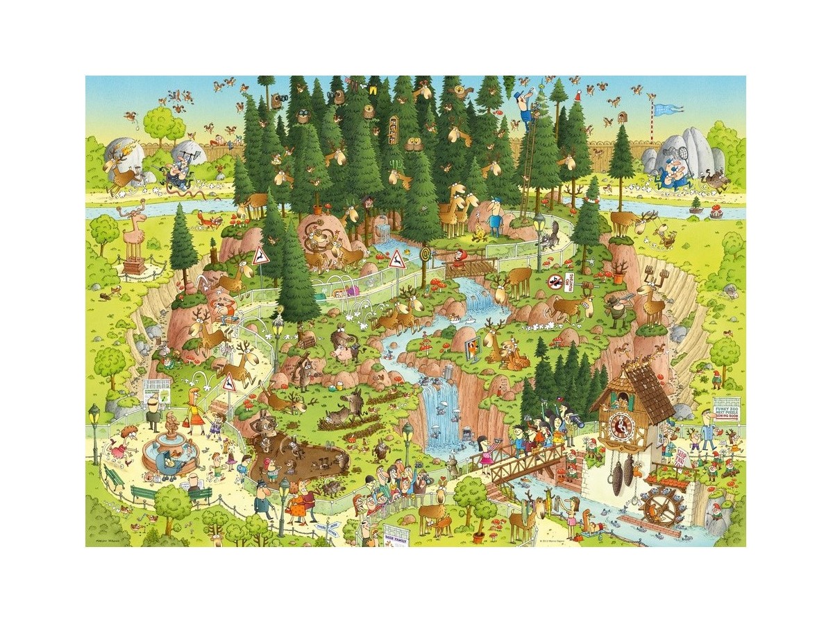 Pe lângă fauna bogată, imaginea include și elemente umane, precum o piață mică, o scenă cu păpuși și diverse activități recreative, ca călăritul sau drumețiile, care se îmbină armonios cu lumea naturală. Un puzzle pentru adulți ideal pentru cei care apreciază satira, umorul și wasgij, oferind o provocare plină de distracție.