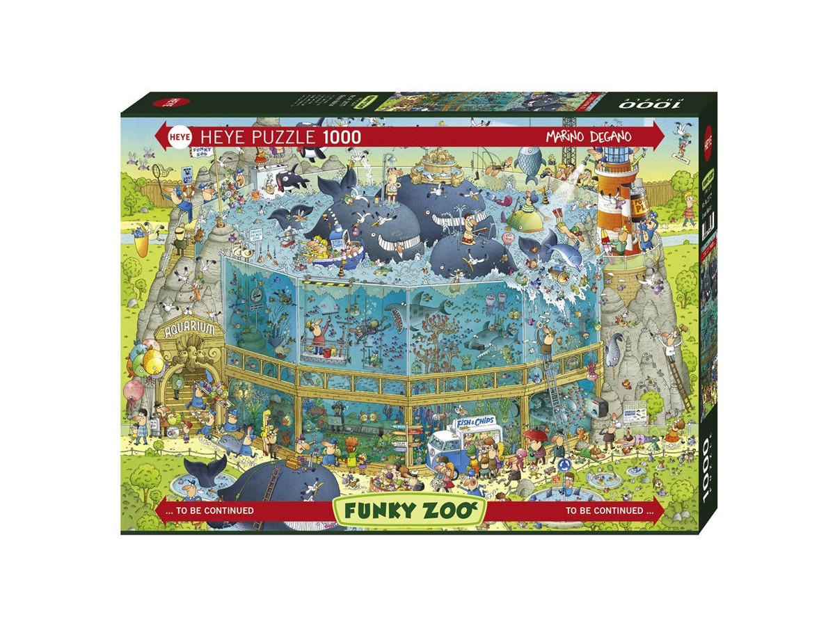 Imaginea acestui puzzle Heye - Marino Degano: Ocean Habitat, cu 1000 de piese (57734), surprinde un habitat oceanic animat și colorat, creat în stilul inconfundabil al artistului Marino Degano. În mijlocul scenei, se remarcă un imens acvariu cilindric, populat de o varietate de vietăți marine, de la pești în culori vii la mamifere precum focile și balenele. Acvariul este decorat cu elemente artistice și vopsit în nuanțe vibrante de albastru și verde. În jurul acestuia, acțiunea continuă, cu diverse personaje care se bucură de activități recreative și admiră minunățiile marine.