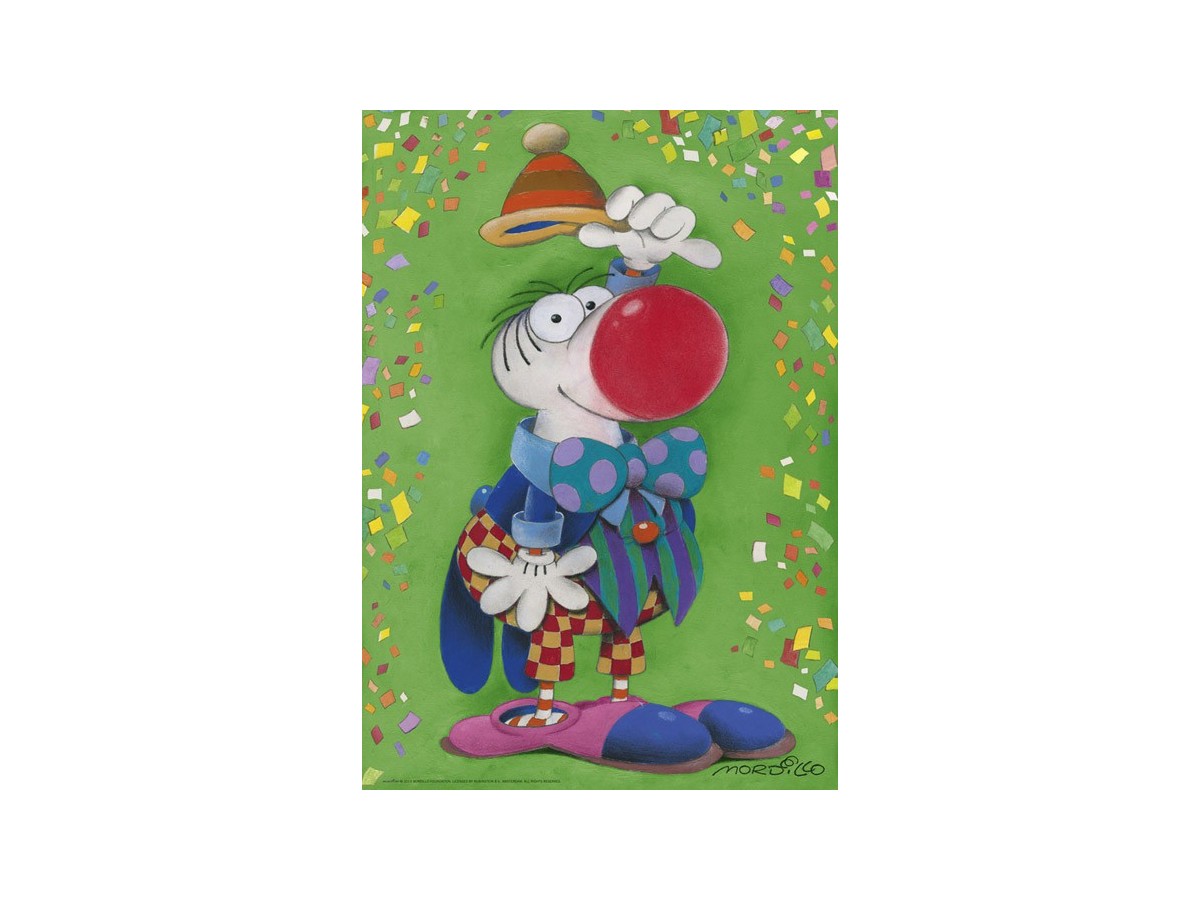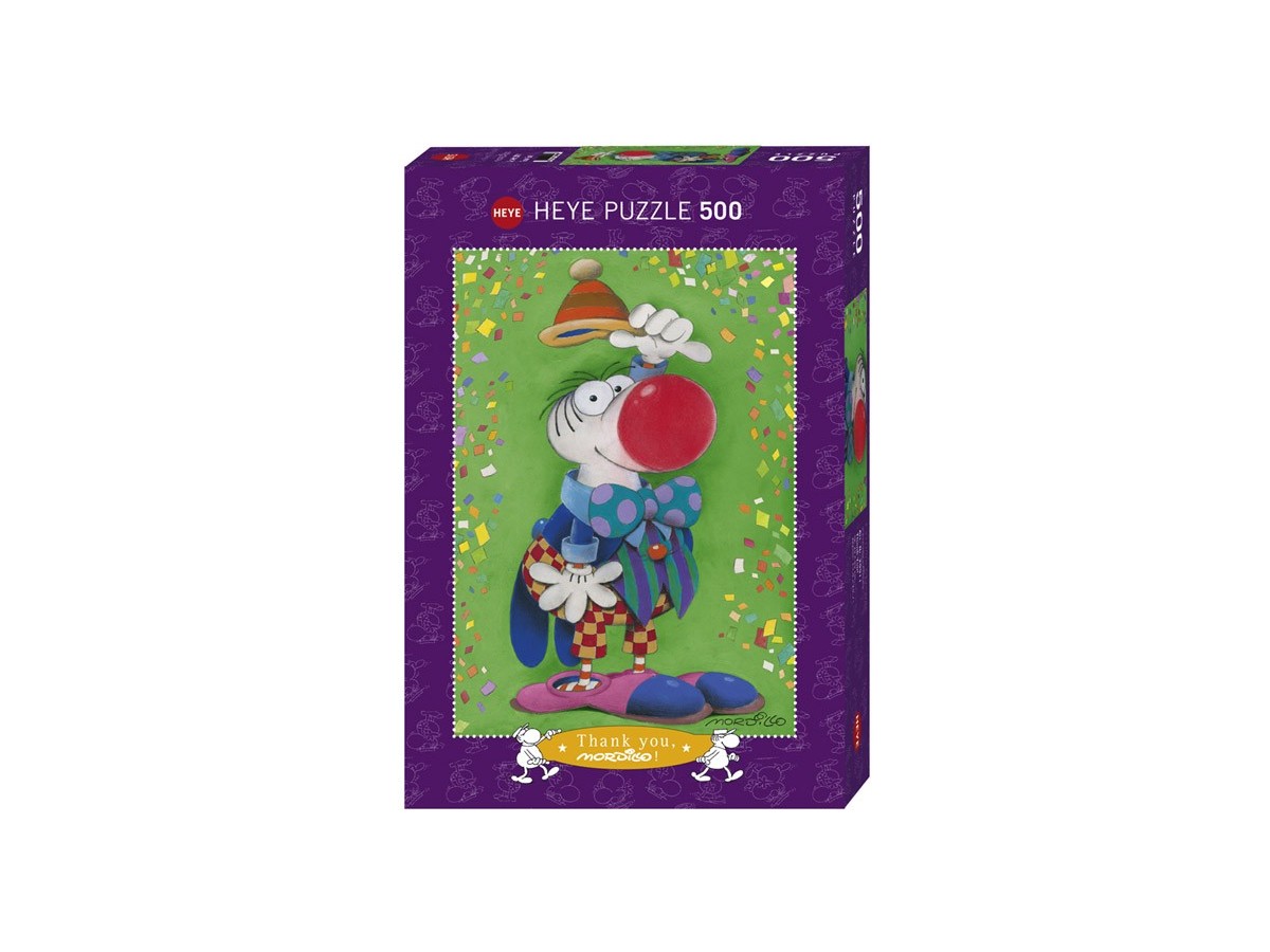 Imaginea acestui puzzle Heye - Thank You!, cu 500 de piese (29911), surprinde un clovn colorat într-un decor festiv, realizat în stilul unei ilustrații. Clovnul, personajul principal, este îmbrăcat într-un costum în dungi și buline, albastru și roșu, cu accente de galben și verde. Pantofii săi sunt de un roz viu, iar pălăria amuzantă în formă de con completează aspectul său vesel. Cu un balon roșu mare pe care îl aplică pe nas, clovnul are o expresie surprinsă și veselă, iar confetti colorate în nuanțe de roșu, galben, verde și albastru cad în jurul său, creând o atmosferă de sărbătoare.