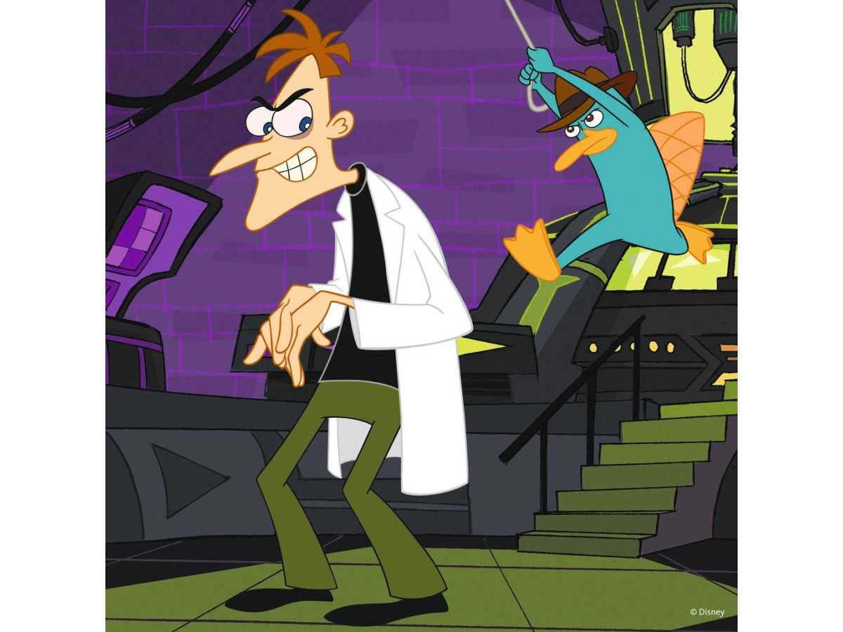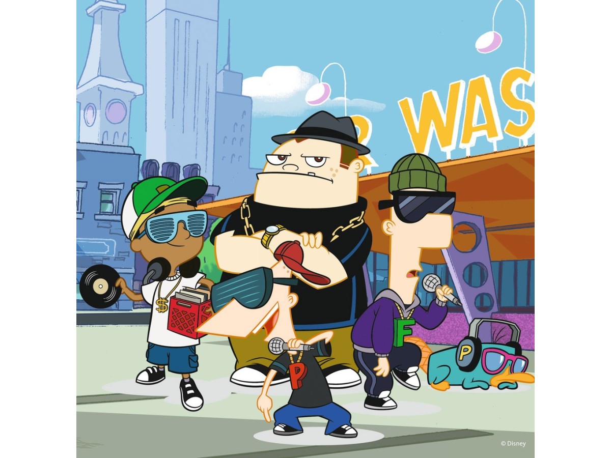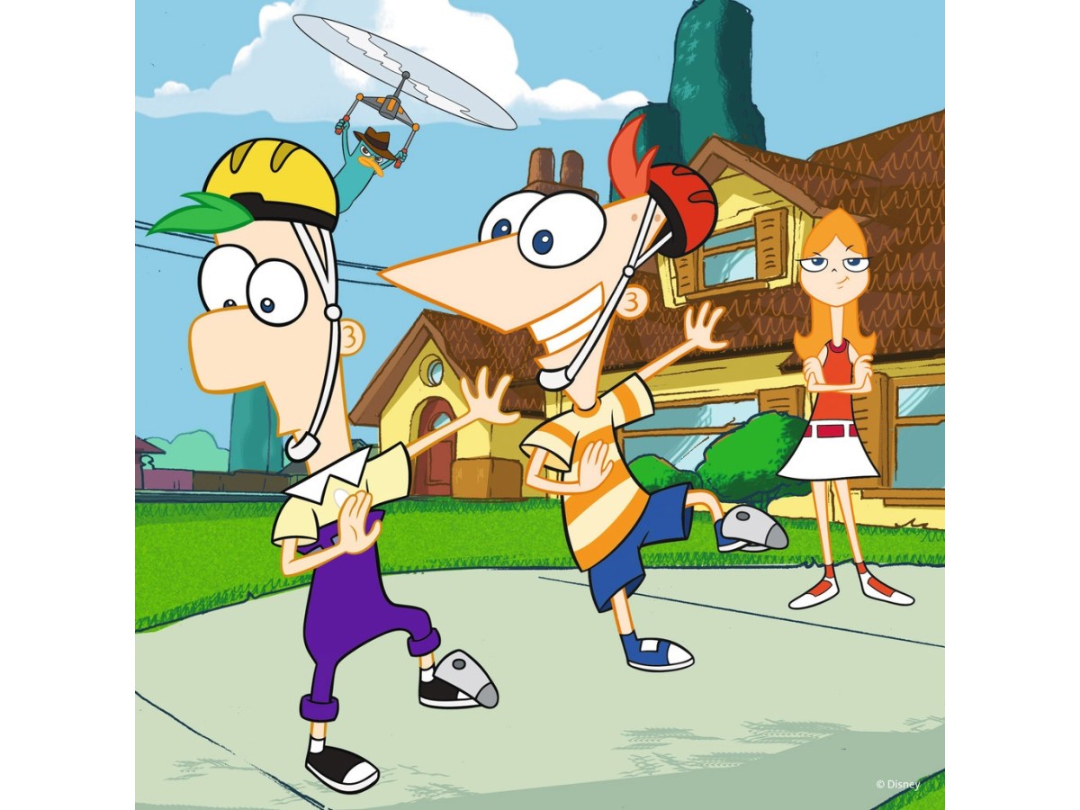Această ilustrație digitală vibrantă redă o scenă din serialul animat Phineas și Ferb, cunoscut pentru umorul și invențiile dinamice ale personajelor principale. În centru, întâlnim trei personaje caracteristice: Phineas, cu părul roșu și un tricou portocaliu, Ferb, într-un tricou violet și păr verde îmbinat cu roșu, și sora lor vitregă, Candace, având păr portocaliu și o fustă albă cu roșu. Cadrul exterior preia fundalul tipic suburban, cu un sentiment jovial și plin de culoare.