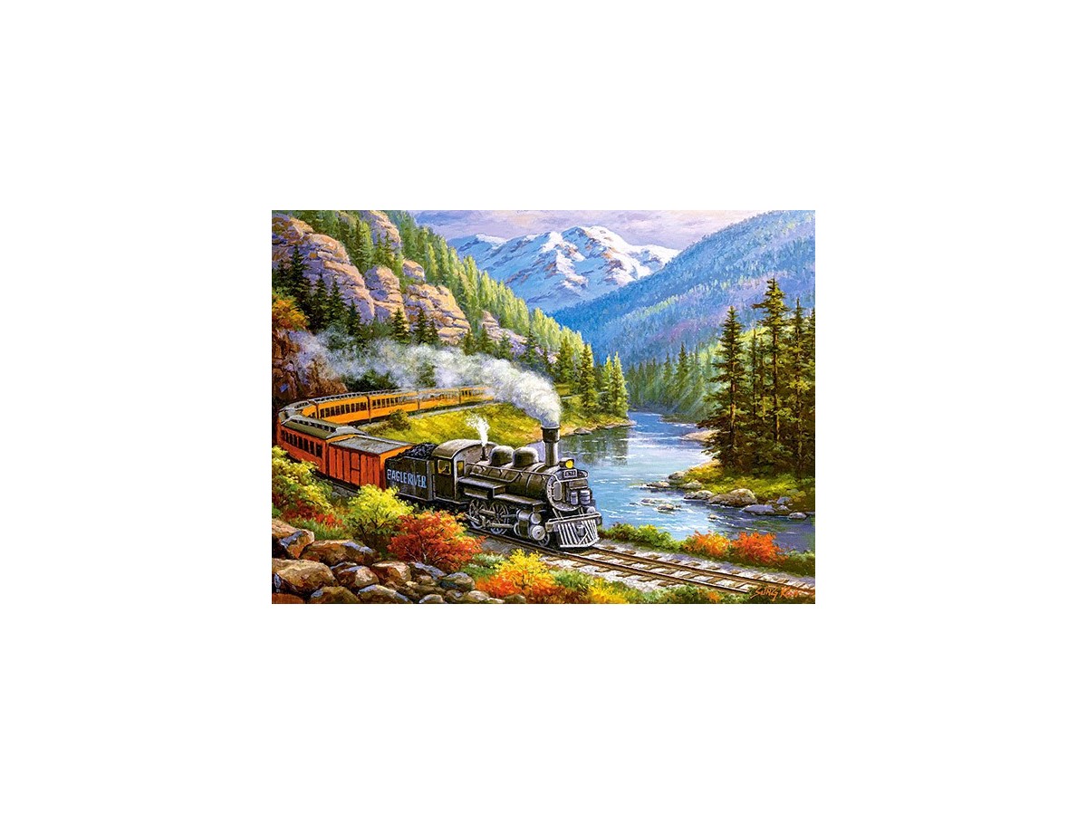 Această ilustrație surprinzătoare prezintă un peisaj montan vibrant, în care un tren cu aburi traversează un pod de fier peste un râu serpuit. Trenul, evidențiat de fața sa frontală mare și negru intens, pare să se miște dinspre privitor, având licăriri de fum alb ce se ridică din coș. Peisajul înconjurător este bogat în culori de toamnă, cu tonuri calde de roșu, portocaliu și galben, reflectându-se în apele lin curgătoare ale râului. În fundal, munții acoperiți de zăpadă domină scena, adăugând o senzație de adâncime și vastitate. Vegetația densă, predominată de conifere verzi, împrejmuește râul, completând această scenă pitorească.