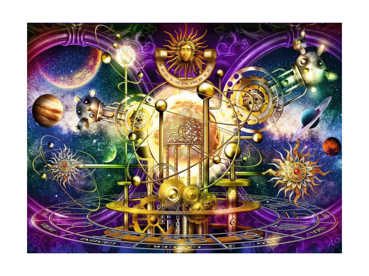 Ilustrația digitală a puzzle-ului Ravensburger cu 500 piese Planete (Ravensburger-16981) prezintă un peisaj cosmic complex, unde diverse corpuri ceresti sunt integrate într-o compoziție vibrantă, plină de culoare. În centrul imaginii, un mecanism auriu, reminiscent al astrolabiilor tradiționale, domină scena, fiind înconjurat de planete de diferite dimensiuni și culori, stele și alte elemente astrale, cum ar fi comete și asteroizi. În fundal, nebuloase colorate în nuanțe de violet, albastru și oranj adaugă profunzime și mister compoziției. În partea de sus, o figură solară cu fața umană adaugă un element mitologic și enigmatic, conectorul vizual între universul științific și cel divin.