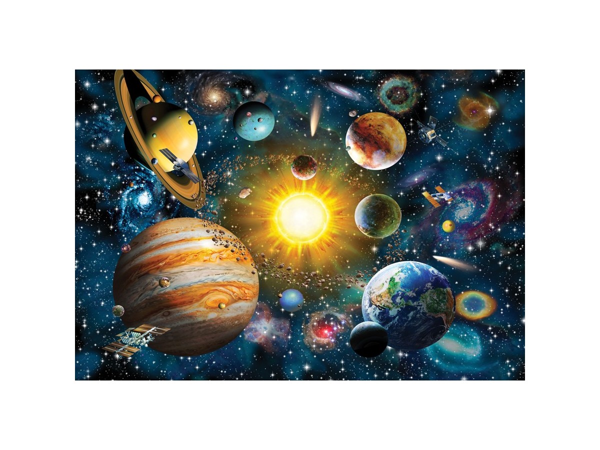 Imaginea acestui puzzle Anatolian - Adrian Chesterman: Solar System, 2000 piese (ANA.3946) surprinde sistemul solar într-o ilustrație digitală vibrantă și plină de culoare. Focalizând pe Soare, luminozitatea și energia sa sunt redate printr-o explozie de culoare galbenă și portocalie care radiază căldură vizuală. Planetele, inclusiv Jupiter cu benzile sale distincte și Pământul, sunt ilustrate cu detalii realistice, fiecare având particularitățile sale unice clare și recunoscute. Spațiul cosmic este plin de stele, comete și alte corpuri cerești minore, creând o compoziție complexă și captivantă.