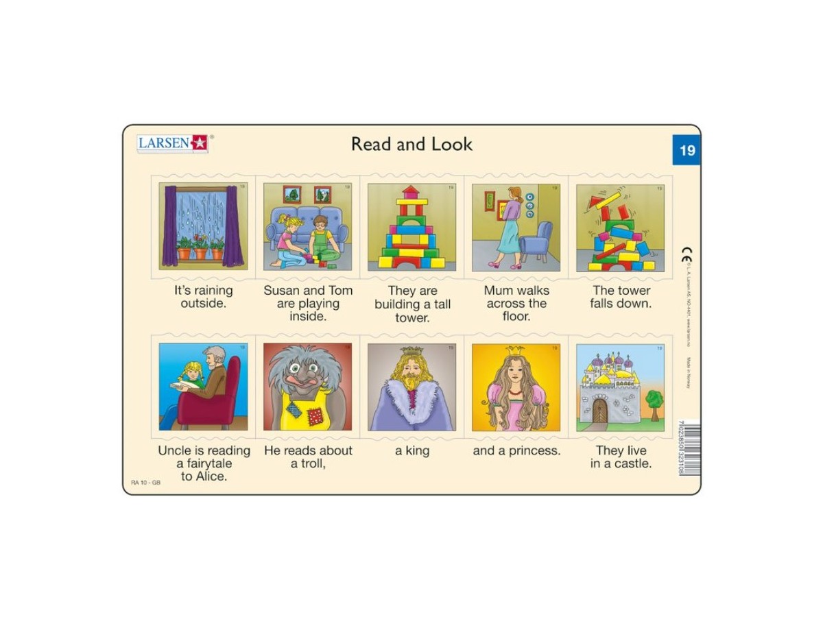 Imaginea acestui puzzle Larsen - Read and Look 19-20, 2x10 piese (48603) este formată din mai multe panouri care prezintă diferite scene cotidiene și imaginare, fiecare având o mică descriere sub ele. Fiecare panou este o ilustrație simplă, puternic colorată, reprezentând activități din viața de zi cu zi sau scene inspirate din povești. De exemplu, unul dintre panouri arată doi copii, un băiat și o fată, jucându-se înăuntru cu blocuri de construcție. Un alt panou prezintă o scenă dintr-o poveste, unde un rege și o prințesă sărbătoresc într-o incintă regală.