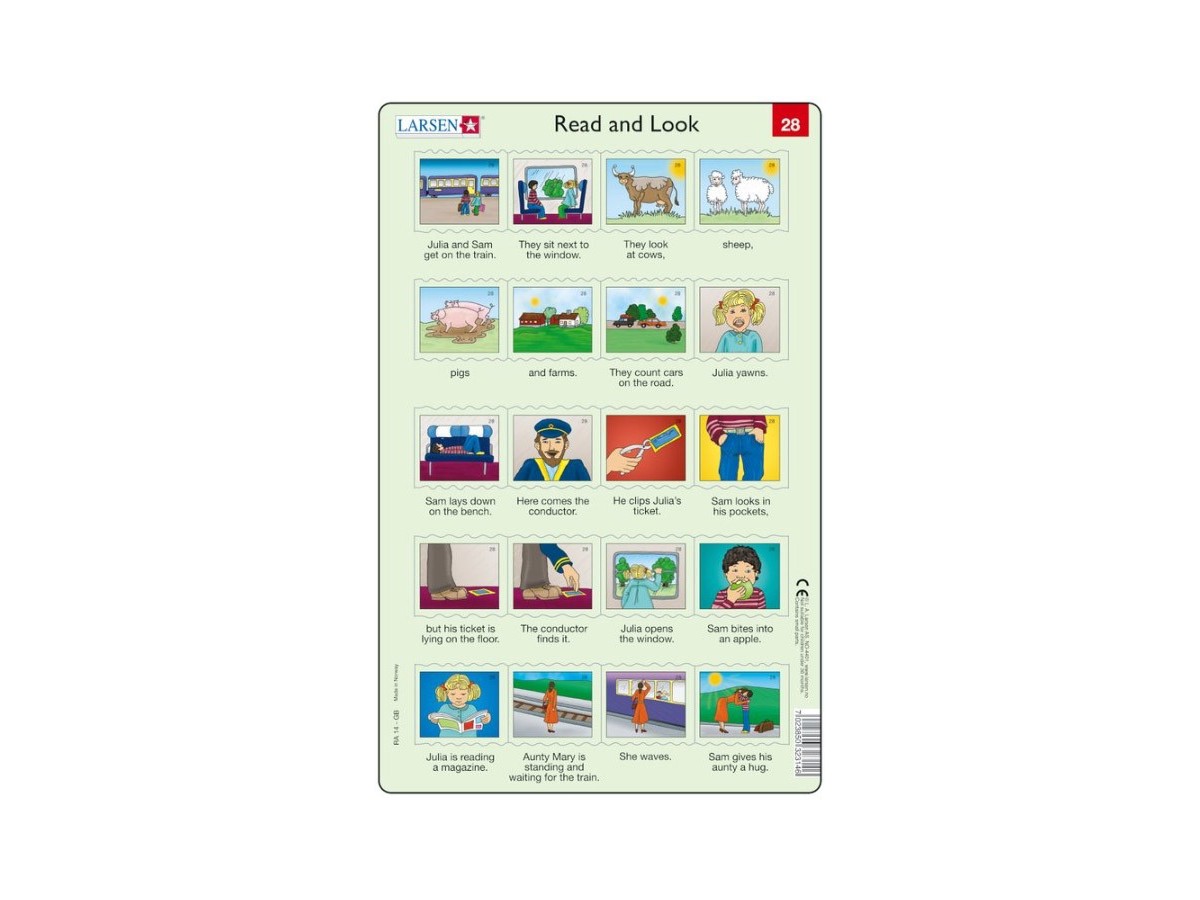 Imaginea puzzle-ului Larsen - Read and Look 27-28, 2x20 piese (48611) prezintă o serie de ilustrații colorate dispuse ca benzi desenate cu cadre multiple. Fiecare cadru ilustrează o scenetă diferită cu personaje umane în activități cotidiene: copii jucându-se cu animale, oameni călătorind cu trenul și interacțiuni zilnice precum cititul ori așteptarea la stația de tren. Personajele sunt stilizate simplu, cu trăsături exagerate tipice cărților pentru copii, ceea ce conferă o notă ludică. Culorile sunt vii și atrăgătoare, iar fundalul fiecărui cadru este minimal, accentuând acțiunile personajelor.