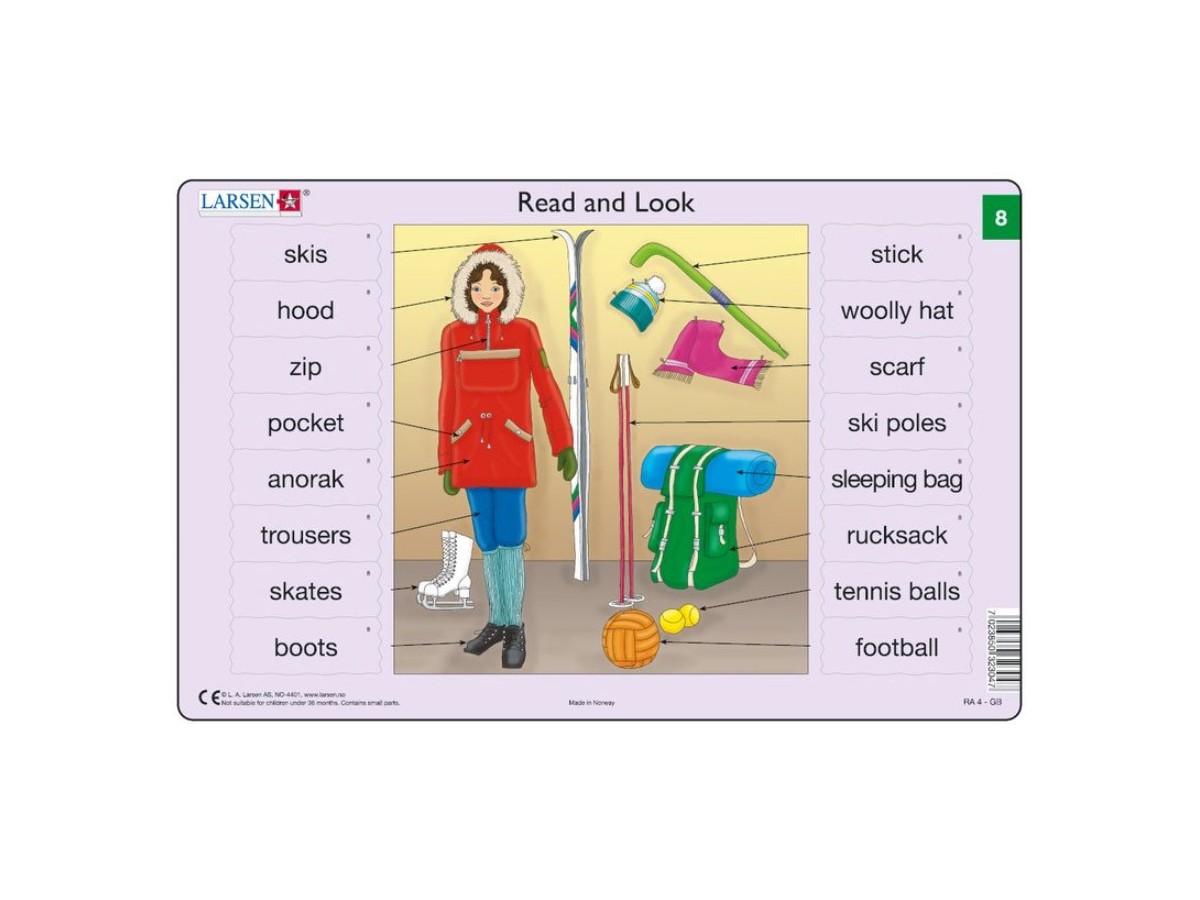 Ilustrația puzzle-ului Larsen - Read and Look 8, 16 piese (48592) surprinde o scenă colorată în care o femeie tânără, îmbrăcată într-un anorak roșu și pantaloni gri, stă în centru cu patinele de gheață în picioare și o haină de iarnă. În fundal, se pot observa diverse echipamente sportive de iarnă, precum schiuri, bățuri de schi, un sac de dormit și o minge de fotbal, toate plasate împotriva unui perete galben. Claritatea culorilor și stilul simplu, direct, sunt potrivite pentru un puzzle educativ destinat învățării copiilor.