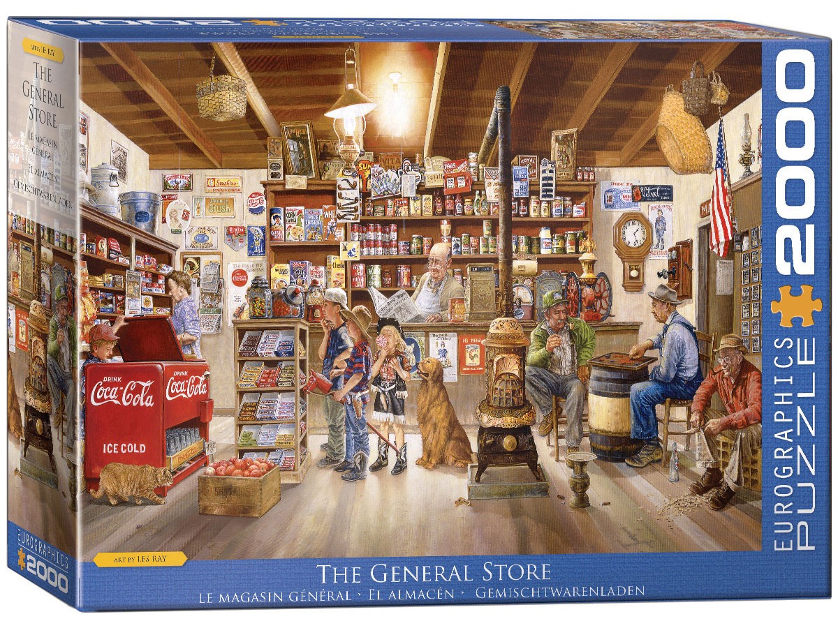 Imaginea acestui puzzle Eurographics - The General Store, cu 2000 de piese, surprinde un magazin general la începutul secolului 20, într-un stil pictural realist. Interiorul este plin de rafturi încărcate cu diverse bunuri, de la conserve până la sticle și alte obiecte de uz casnic. În centrul scenei, un bărbat în vârstă stă rezemat de tejghea, discutând cu un tânăr. Pe podea, un câine stă lângă un băiat mic, care privește la o cutie expusă. Atmosfera este caldă, cu lumină naturală filtrându-se prin fereastră, reflectând pe podeaua din lemn și pe ambalajele colorate. O scenă vie de viață cotidiană ce surprinde esența comunităților rurale americane.