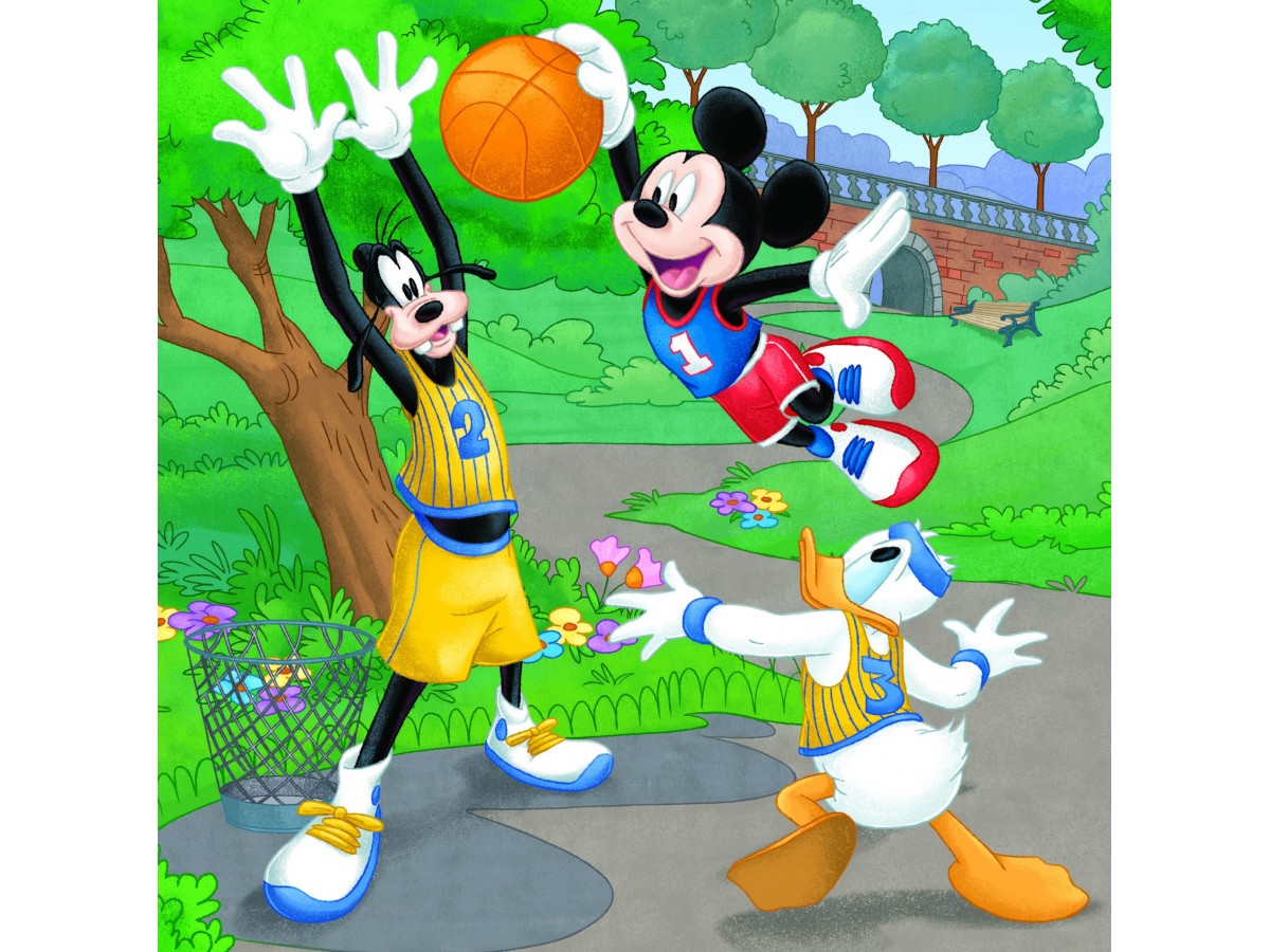 Această ilustrație prezintă un grup de personaje animate din franciza Disney, participând la diverse activități recreative într-un parc. În centrul scenei, Mickey Mouse poartă un echipament de baschet și aruncă o minge de baschet, sub privirile încurajatoare ale prietenilor săi. Pe fundal, Minnie Mouse și Daisy Duck admiră flori, în timp ce Goofy și Donald Duck se joacă cu o minge. Scena este vibrant colorată, cu o gamă largă de culori vii care contribuie la atmosfera veselă a ilustrației. Ilustrația este digitală, redând în detaliu expresiile personajelor și elementele de mediu.