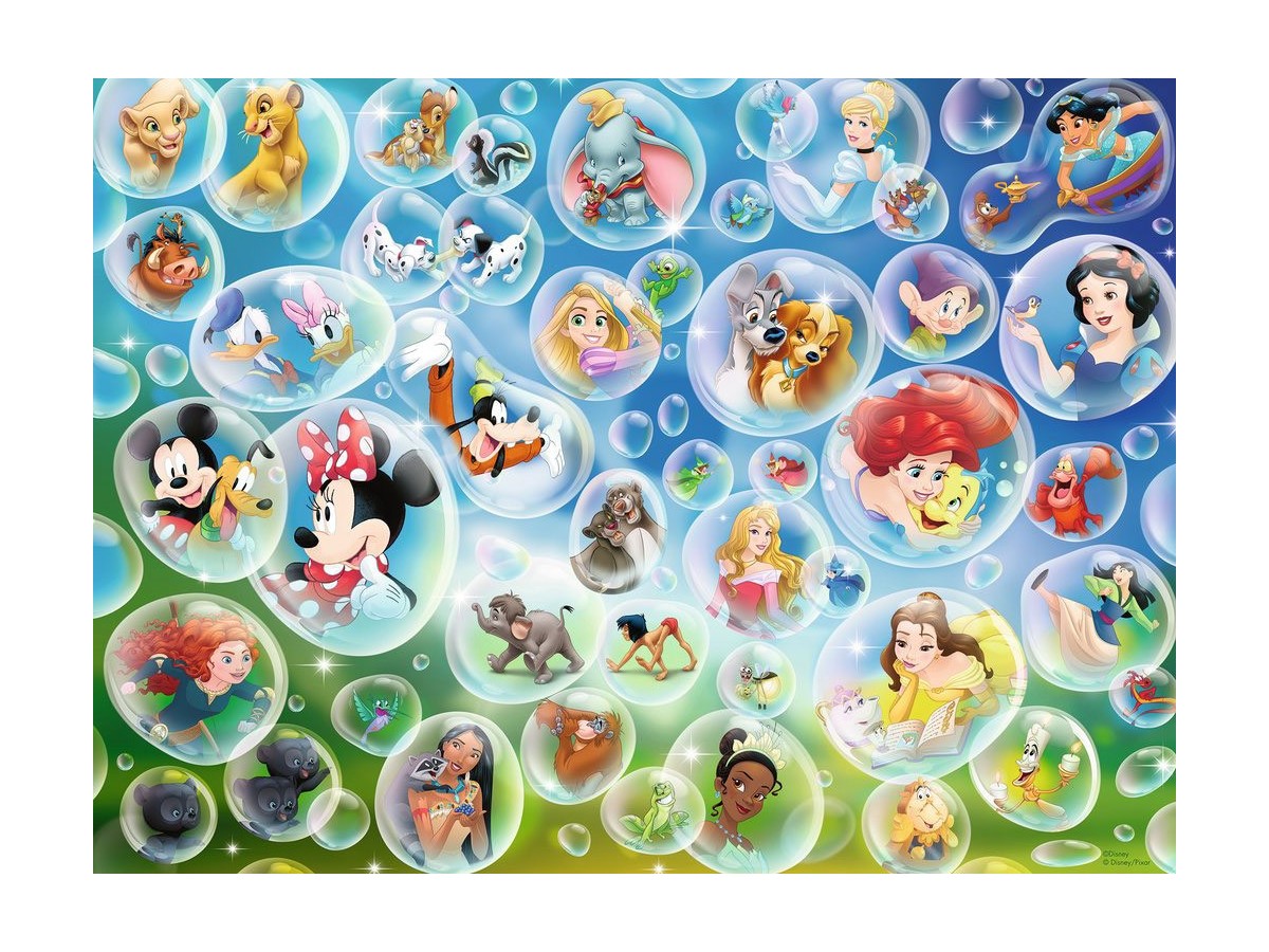 Imaginea prezentată este o ilustrație colorată ce conține o serie de portrete ale unor personaje celebre din francizele Disney, fiecare fiind înconjurat de bule de săpun. Personajele includ figuri iconice precum Mickey Mouse, Minnie Mouse, prințese Disney precum Cenușăreasa, Alba ca Zăpada, Ariel și Belle, precum și alte personaje din filme Disney precum Simba, Bambi și Dumbo. Acești eroi animați sunt ilustrați în stilul clasic al desenelor animate, cu culori vii și expresii caracteristice, creând o compoziție veselă și atractivă.