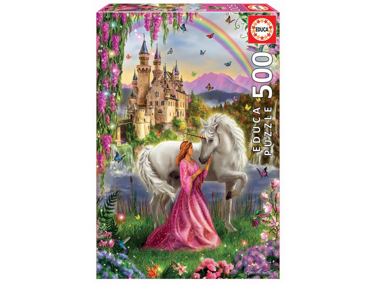 Ilustrația puzzle-ului Fairy And Unicorn de la brandul Educa surprinde o scenă încântătoare plasată într-un regat fantastic. O tânără cu păr roșcat, îmbrăcată într-o rochie lungă roz, stă alături de un unicorn alb, aparent având un moment special de conexiune. În fundal, se întinde un castel cu turnuri înalte și arhitectură gotică, iar cerul este încadrat de un curcubeu, completând atmosfera de basm a întregii compoziții.
