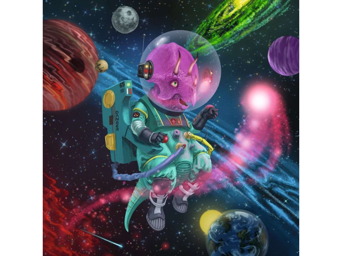 Imaginea ilustrează un dinozaur îmbrăcat într-un costum de astronaut de culoare roșie, plutind în spațiul cosmic. Pe fundal se pot observa Număroase elemente cosmice, inclusiv galaxii spiralate, stele strălucitoare și planete de diverse dimensiuni și culori. Această ilustrație digitală este realizată cu o paletă de culori intens vibrante, predominând nuanțe de albastru, violet și roz, care contribuie la crearea unei atmosfere misterioase și captivante. Dinozaurul, cu un design imaginativ, poartă pe spate un rucsac spațial și este înconjurat de detalii futuristice precum module spațiale.