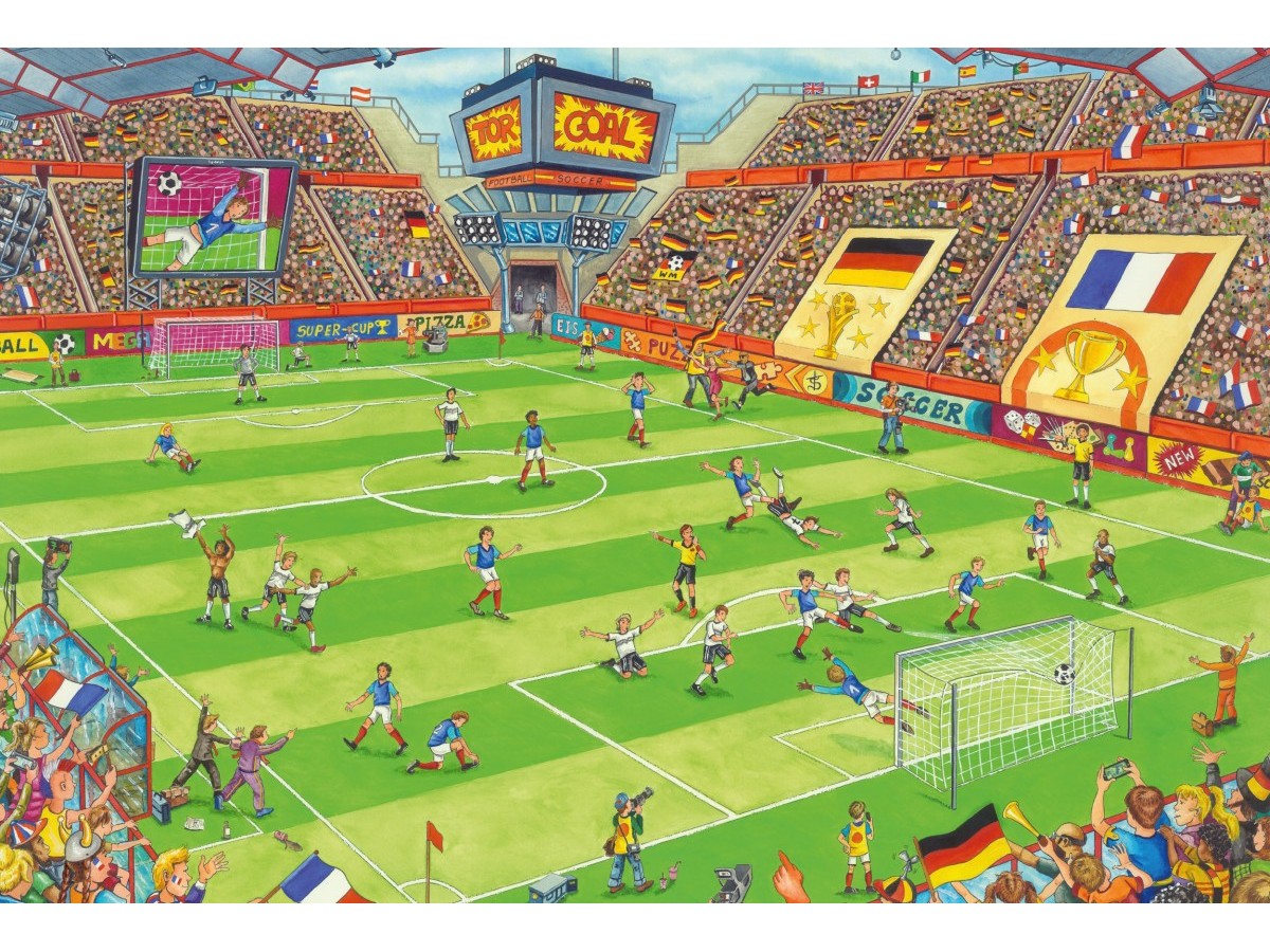 Ilustrația puzzle-ului Soccer Finals de la Schmidt surprinde o scenă animată de fotbal într-un stadion plin de spectatori. Momentul unui meci important este redat cu jucători de fotbal în diverse acțiuni pe teren - unii aleargă, alții execută pase sau se pregătesc să șuteze la poartă. Publicul din tribune este variat și colorat, mulți fani fiind înfățișați purtând eșarfe, steaguri și diverse accesorii reprezentative pentru țările sau echipele pe care le susțin. Pe fundal, panouri publicitare și un scor electronic adaugă un detaliu realist scenei, evocând atmosfera electrizantă a unui meci de campionat.