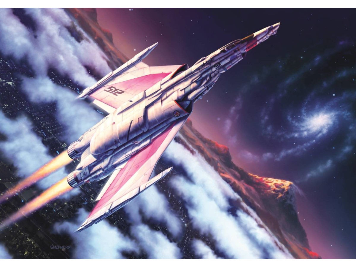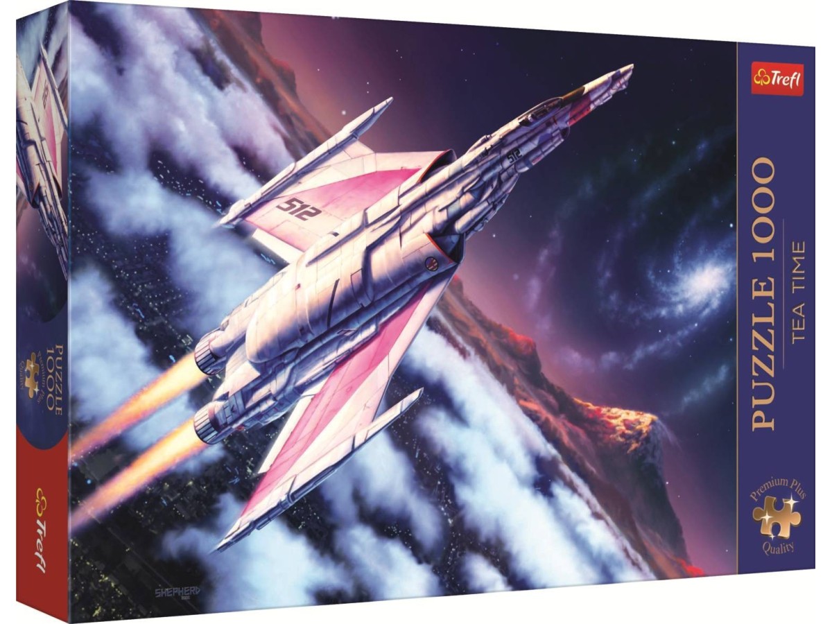 Imaginea prezintă un puzzle cu 1000 de piese de la brand-ul Trefl, intitulat Tea Time: Flight into space (Trefl-12075). Ilustrația digitală redă o navă spațială mare, zburând deasupra unei planete roșii cu munți înalți, într-un decor cosmic cu stele și nebuloase colorate. Orașele luminate de pe suprafața planetei adaugă un contrast interesant cu peisajele naturale înconjurătoare, sugerând explorare și aventură între stele.