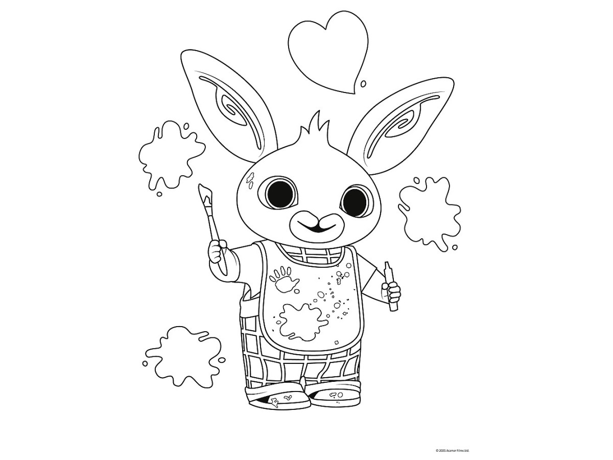 Ilustrația reprezintă o scenă din serialul animat Bing, plasată într-un mediu vibrant și colorat. În prim-plan, se observă două personaje principale: Bing, un iepuraș negru cu o salopetă roșie, și Flop, un personaj mai mic de culoare portocalie. În spatele lor se întinde un peisaj idilic, probabil un parc, cu iarbă verde și cer albastru, punctat de câțiva nori pufoși. Atmosfera este veselă și prietenoasă, fiind evidentă prin expresiile fericite ale personajelor și prin culorile luminoase ale decorului.