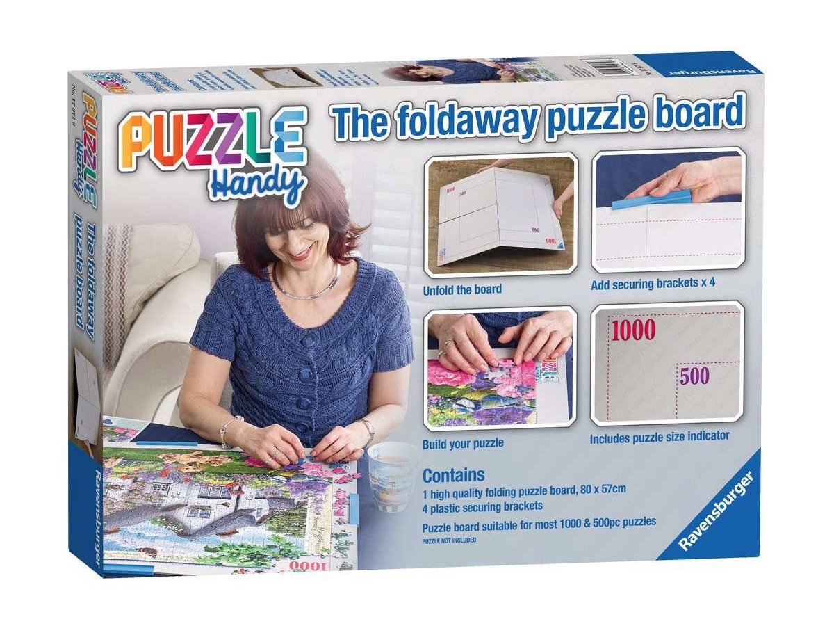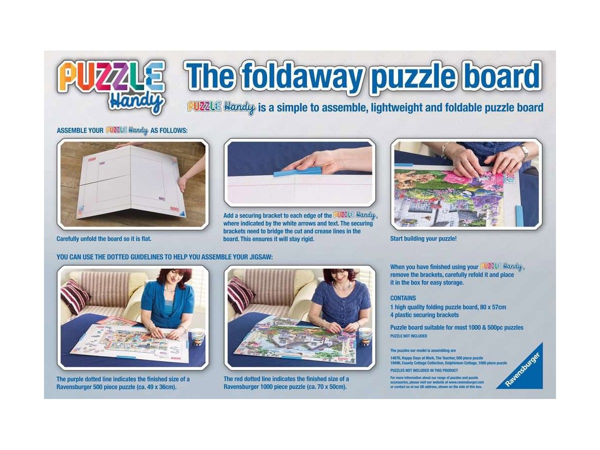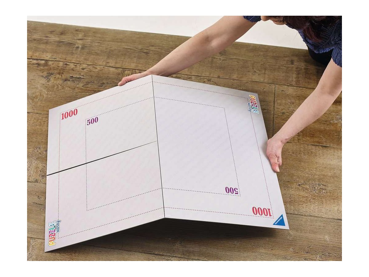 Imaginea plăcii pentru puzzle Ravensburger - Foldaway Puzzle Board (17971) surprinde diferite momente legate de asamblarea și utilizarea tablei pliabile. În partea stângă sus, se poate observa tabla pliată, așezată pe un fundal neutru. În centrul părții superioare, o diagramă explică modul de desfășurare a tablei, iar în partea dreaptă sus, două persoane sunt surprinse aranjând piesele pe tabla extinsă. Partea de jos a imaginii prezintă diferite aspecte ale utilizării tablei: o persoană care începe să aranjeze piesele, tabla complet deschisă cu piese parțial aranjate și tabla pliată din nou, cu un mâner vizibil pentru transport.